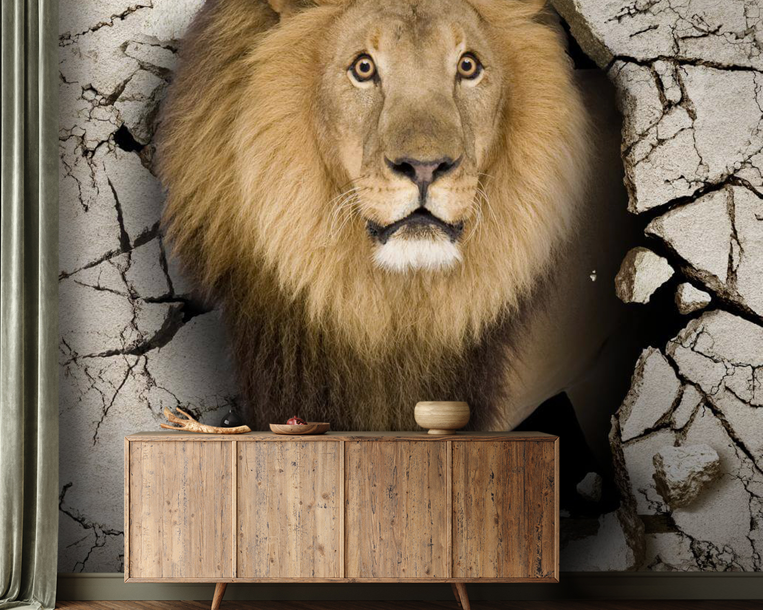 Transform your space with this stunning wall mural—a magnificent lion making a bold entrance. It’s not just a pretty picture; it’s like having a slice of the wild right in your living room. Imagine cozying up on the couch, glancing at this lion striding through a cracked wall, and feeling a rush of adventure. It’s perfect for those who love to mix elegance with a hint of the wild. Plus, you might get a chuckle when guests do a double-take—”Did that lion just come through the wall?” It’s a piece that invites conversation and curiosity, making any room feel alive and dynamic. Perfect for animal lovers or anyone who wants to add an unexpected twist to their decor!