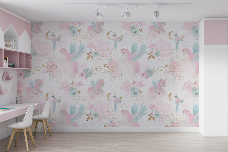 Proměnit místnost v rozmarnou říši divů je tak snadné jako srolování této nástěnné malby s veselými jednorožci uprostřed pastelových květů. Představte si to: fádní stěna náhle ožije a vyvolá úsměvy dětí i dospělých. Jemné odstíny vytvářejí snovou atmosféru, která je ideální pro hraní nebo jen snění. Představte si, že čtete knihu v tomto kouzelném prostředí, kde každý pohled je jako vstup do pohádky. Přidejte kapku fantazie a získáte prostor, který působí hřejivě a lákavě a kde za každým rohem čeká dobrodružství.