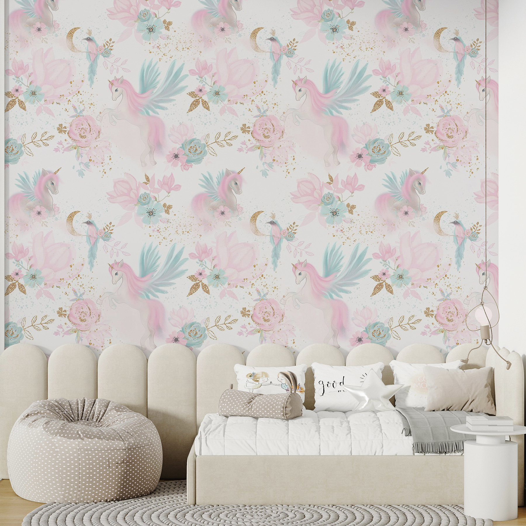 Proměnit místnost v rozmarnou říši divů je tak snadné jako srolování této nástěnné malby s veselými jednorožci uprostřed pastelových květů. Představte si to: fádní stěna náhle ožije a vyvolá úsměvy dětí i dospělých. Jemné odstíny vytvářejí snovou atmosféru, která je ideální pro hraní nebo jen snění. Představte si, že čtete knihu v tomto kouzelném prostředí, kde každý pohled je jako vstup do pohádky. Přidejte kapku fantazie a získáte prostor, který působí hřejivě a lákavě a kde za každým rohem čeká dobrodružství.