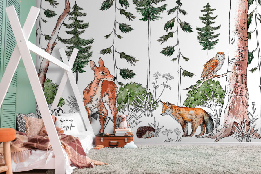 Proměňte jakýkoli prostor pomocí této okouzlující nástěnné malby s roztomilými lesními zvířátky! Představte si klidnou lesní scenérii, kde mezi bujnou zelení pobíhá zvědavý jelen a hravá liška. Sova je pozoruje shora a dodává scéně nádech fantazie. Je to, jako byste měli kousek přírody přímo na své zdi. Tato fototapeta je ideální do útulného koutku na čtení nebo do dětského pokoje, protože vnáší do interiéru atmosféru přírody a každý pohled na ni je malým dobrodružstvím. Šiřte radost a teplo a nechte příběhy ožívat ve svém vlastním kouzelném lese – s těmito chlupatými přáteli se nikdy nebudete nudit!