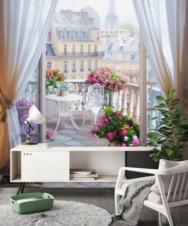 Představte si, že vstoupíte do svého obývacího pokoje a ocitnete se na klidném pařížském balkoně – ach, to kouzlo! Tato nástěnná malba “Klidný pařížský balkon s květinami” snadno promění váš prostor v elegantní evropské útočiště. Představte si to: křehké židle z tepaného železa, živé květy rozlévající se přes květináče a Eiffelova věž, která vykukuje skrz měkké sluneční světlo. Je to jako okamžitá dovolená bez balení.