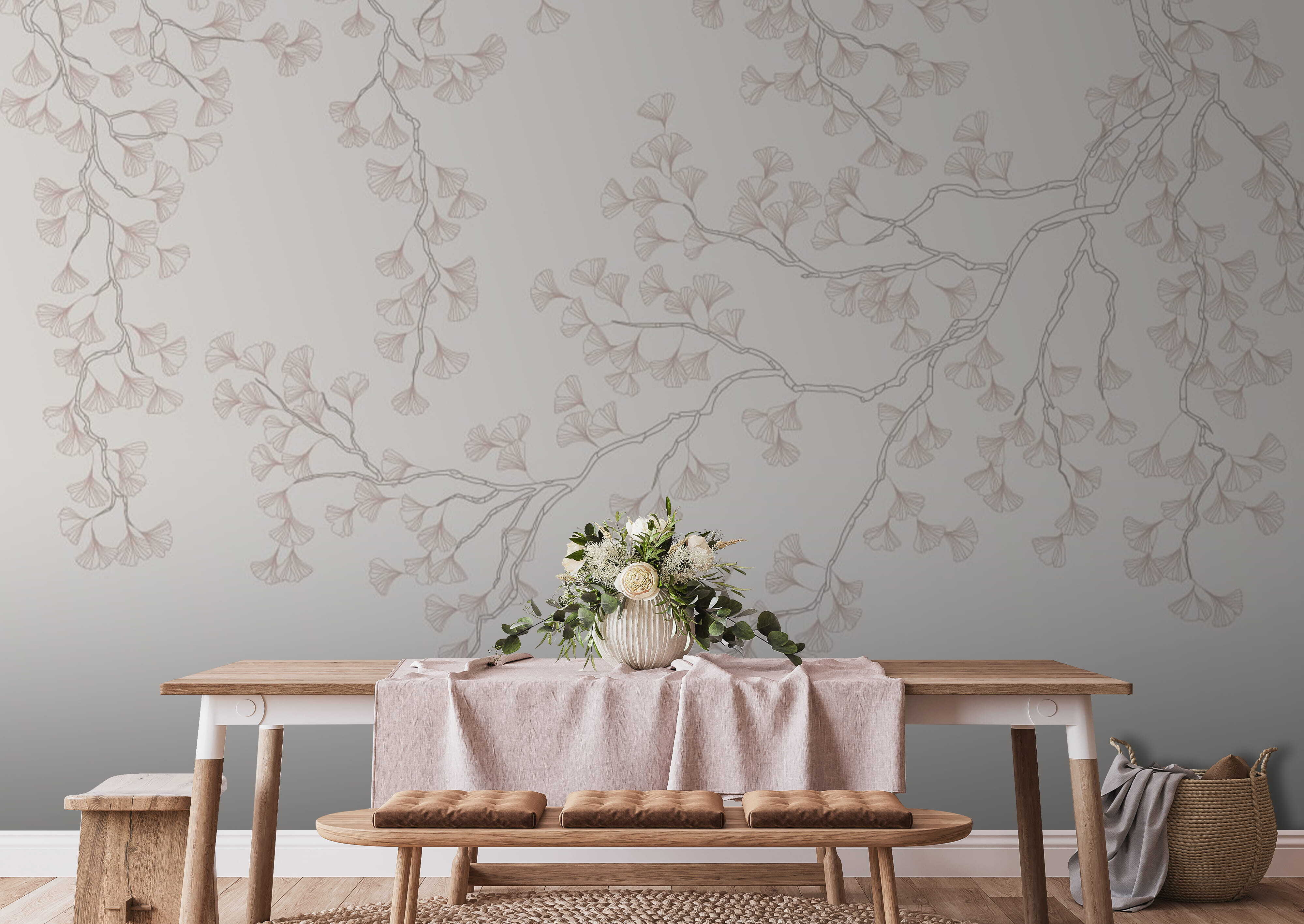 Promluvme si o nástěnné malbě “Tekoucí vzor větví ginkga”. Představte si, že vstoupíte do místnosti, kde tyto jemné linie a měkké barevné tóny větví ginkga bez námahy plynou po stěně. Je to jako přenést si kousek klidné přírody přímo do svého domova. Ideální do každé místnosti, kde chcete docílit nádechu klidné elegance. Větve se téměř zdají pohupovat v jemném vánku – možná se při pohledu na ně dokonce přistihnete při snění. Ať už se nachází ve vašem obývacím pokoji, ložnici, nebo dokonce v útulném čtecím koutku, tato nástěnná malba promění obyčejnou stěnu v klidné útočiště.