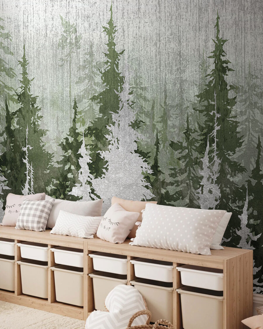 Proměňte svůj prostor pomocí této okouzlující nástěnné malby lesa, kde stromy jako by šeptaly větru svá tajemství. Je to jako vstoupit do klidné lesní krajiny, aniž byste museli opustit svůj obývací pokoj. Představte si útulné večery strávené popíjením čaje při pohledu na klidnou zeleň a jemnou šeď. Vrstvy stromů vytvářejí hloubku, téměř jako snový únik z každodenního života. Je ideální pro každého, kdo chce pozvat krásu přírody do svého domova. Tato nástěnná malba nezdobí jen stěnu, ale vdechne život každé místnosti. Možná se dokonce přistihnete, že vás zajímá, jestli se kolem prohání veverka!