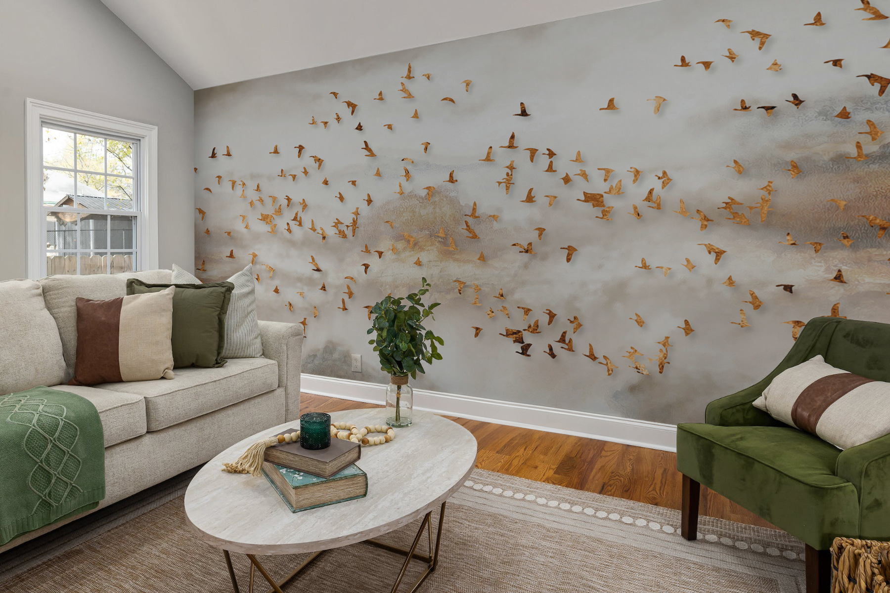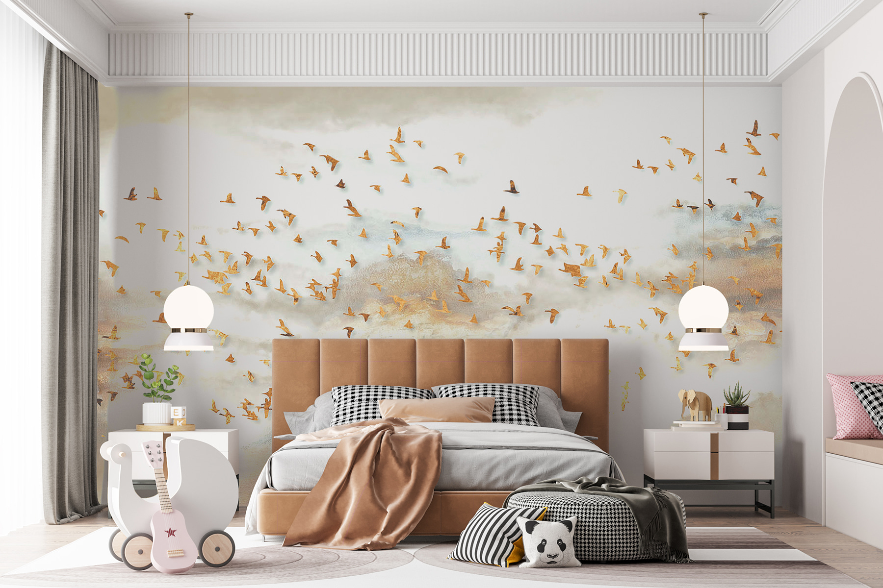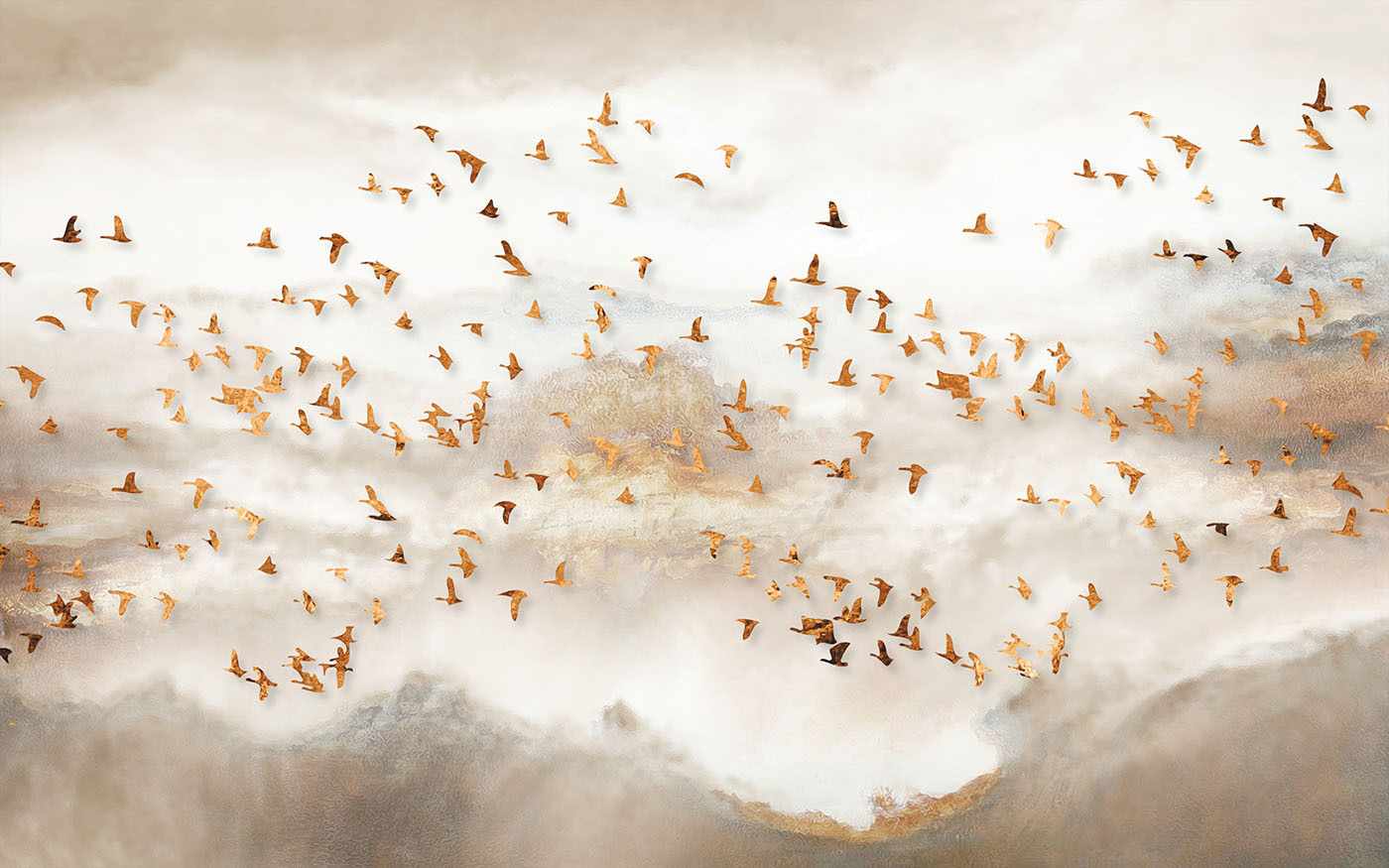Proměňte každou místnost v klidné útočiště s touto úžasnou nástěnnou malbou skupiny ptáků letících po zasněné obloze. Jemné barvy a půvabní ptáci vytvářejí atmosféru, která působí klidně a povzbudivě, jako svěží vánek v jarním dni. Představte si, jak při pohledu na tento podmanivý výjev popíjíte ranní kávu nebo se ukládáte k odpočinku po dlouhém dni. Vtáhne vás dovnitř a vyvolá ve vás sny a příběhy. Navíc dodá elegantní nádech každému prostoru, ať už je to útulný obývací pokoj nebo klidná ložnice. Kdo by se nechtěl cítit, jako by se vznášel v oblacích?