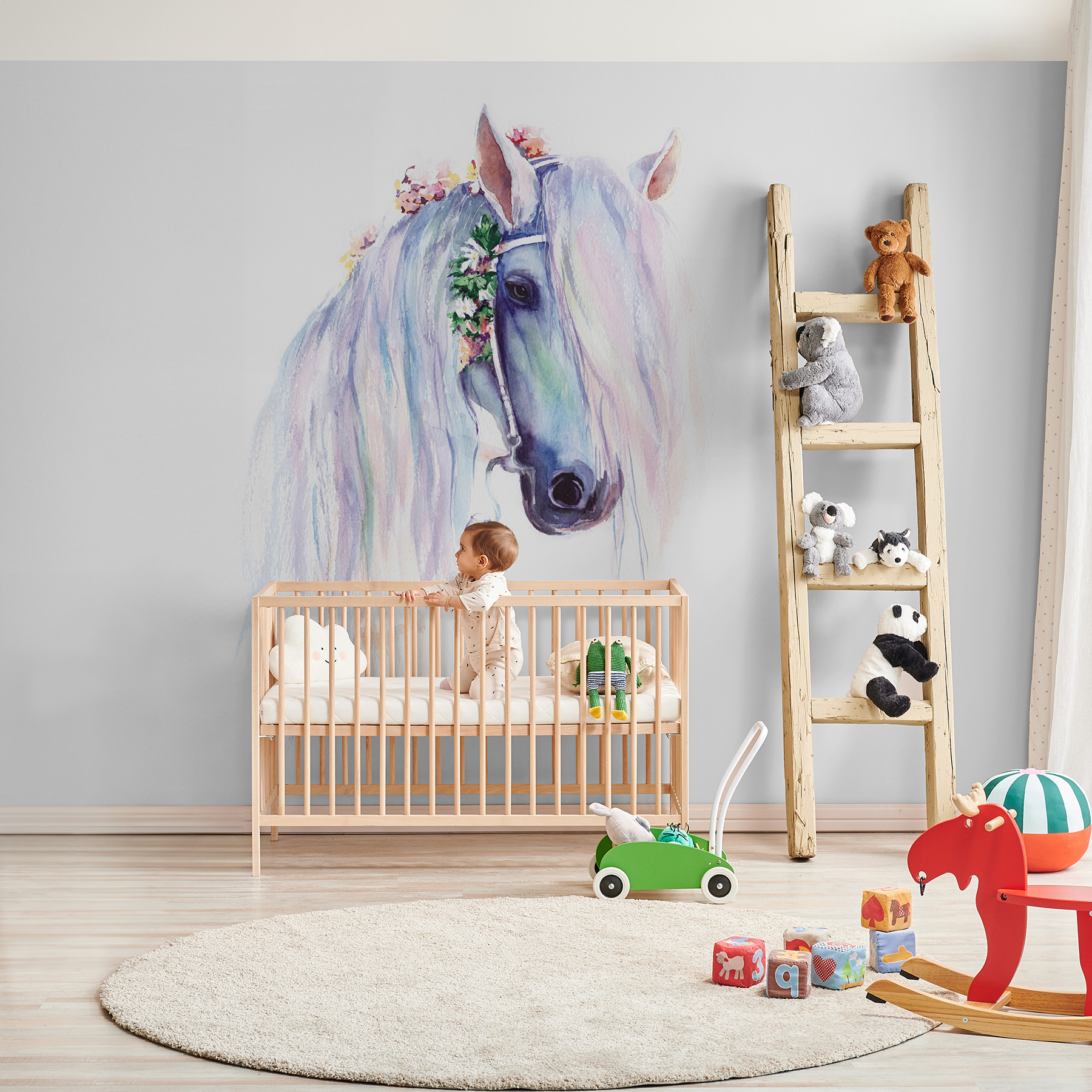 Oživte každý prostor touto nádhernou nástěnnou malbou s majestátním koněm ozdobeným květy. Představte si, že vejdete do místnosti a přivítá vás tento něžný obr, jehož elegantní hříva se kaskádovitě snáší jako barevný vodopád. Je ideální pro děti i milovníky rozmarných dekorací a přináší dotek přírody přímo do interiéru. Jemné pastelové barvy vše odlehčují, takže je těžké se neusmívat. Představte si, jak si s malými dětmi čtete pohádku, zatímco se krčíte v blízkosti této nástěnné malby – každý pohled je malým dobrodružstvím, které čeká, až se stane. Není to jen dekorace, je to pozvánka ke snění!