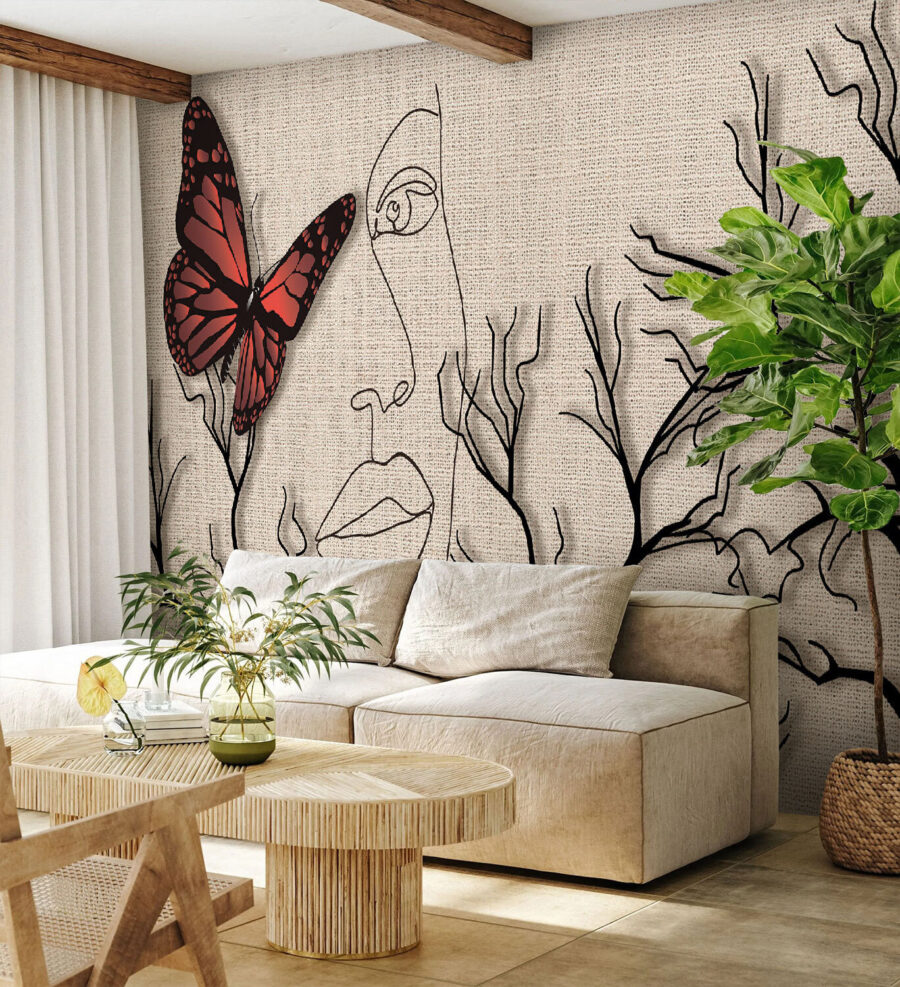 Proměňte svůj prostor pomocí této úchvatné tapety, na které je vyobrazen motýl tančící poblíž tváře ženy, obklopený jemnými větvičkami. Není to jen umění, je to vyjádření – jako byste si na zeď zachytili klidný okamžik. Představte si, že se každý den probouzíte s touto krásou; zářivý motýl vnáší do života energii, zatímco jemné výrazy vyvolávají pocit klidu. Je ideální do útulného obývacího pokoje nebo kreativního koutku, kde vzbuzuje zvědavost a podněcuje konverzaci. A navíc, kdo nemá rád motýly? Jsou jako malí umělci přírody, kteří dodávají kouzlo a fantazii. Vychutnejte si atmosféru, která je jedinečně vaše!