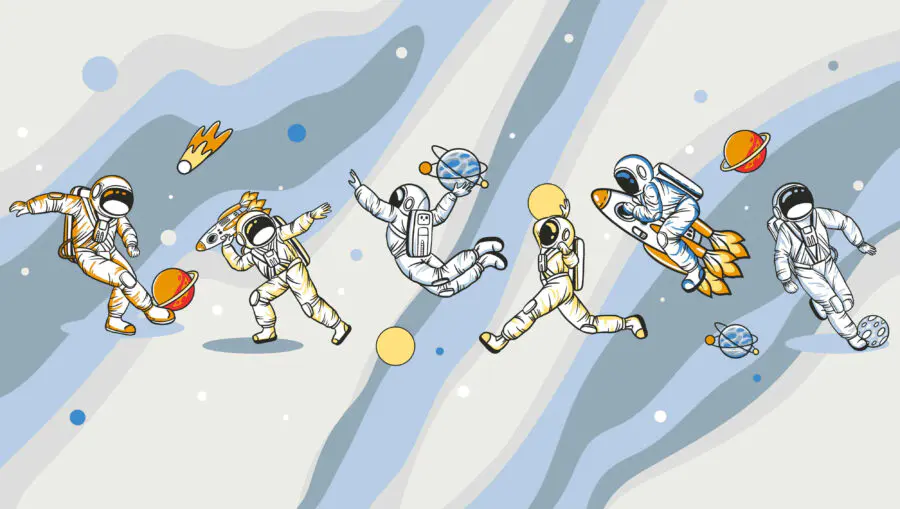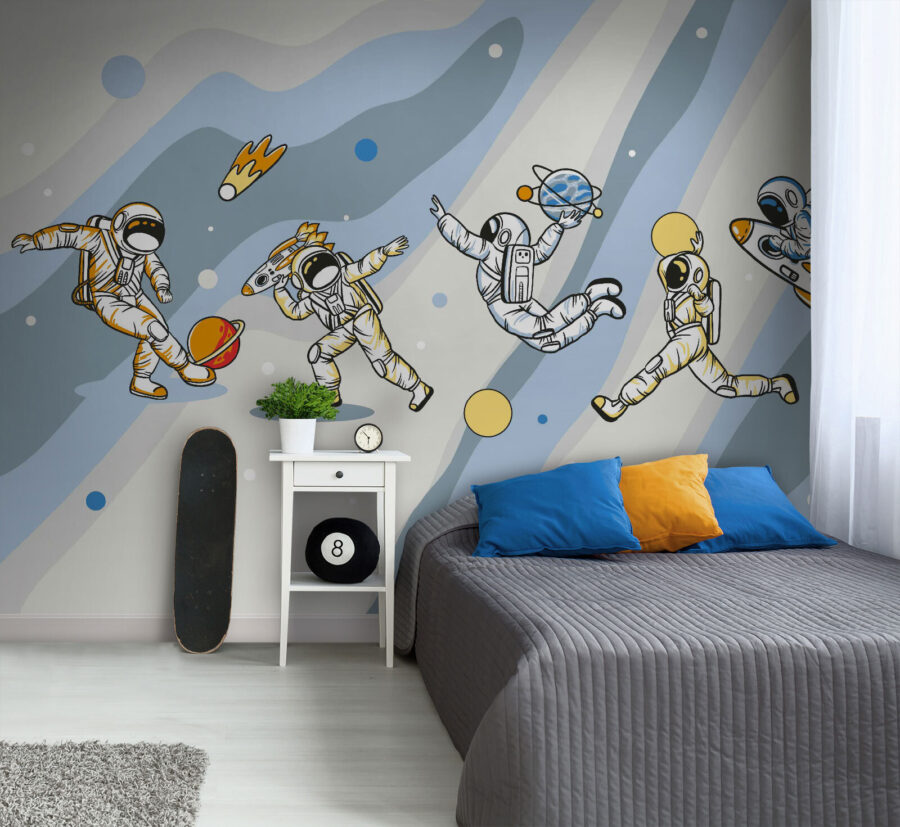 Podívejte se na tuto opravdu skvělou nástěnnou malbu – “Karikatura astronauta s raketou na hlavě”. Je to jako oživlý komiks, ideální pro přidání zábavy a dobrodružství do každé místnosti. Představte si, že to máte v dětském pokoji nebo herně… malé detaily, jako jsou astronauti tančící kolem planet, vás prostě rozesmějí. Navíc naprosto podněcuje představivost – kdo by nechtěl snít o vesmírných cestách a raketových lodích? Je to zábavné, nepředvídatelné a trochu mimo, přesně jako každé správné dobrodružství. Je to super zábavný způsob, jak udělat prostor kreativní a živý!