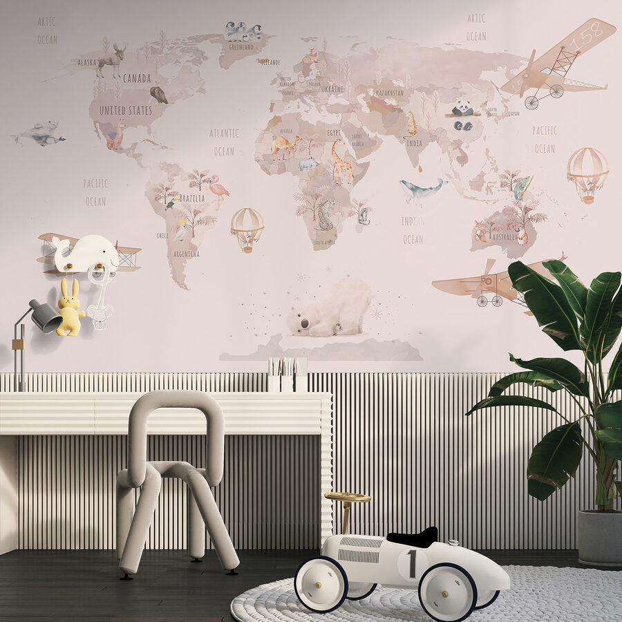 S touto nádhernou nástěnnou malbou “Mapa světa” proměníte každou místnost v rozmarnou cestu kolem světa. Je jako milostný dopis dobrodružství, obsahuje okouzlující ilustrace zvířat a hravých letadel, které okamžitě vzbudí zvědavost a touhu po cestování. Představte si, jak malé děti ukazují na své oblíbené země nebo sní o exotických zemích, zatímco jsou obklopeny těmito okouzlujícími vzory. Díky jemným barvám a hravým prvkům promění stěny v plátno plné fantazie – ideální do dětských pokojů nebo heren. Tato nástěnná malba nejen zdobí; vybízí k vyprávění příběhů a snění. Tak se pusťte do objevování!