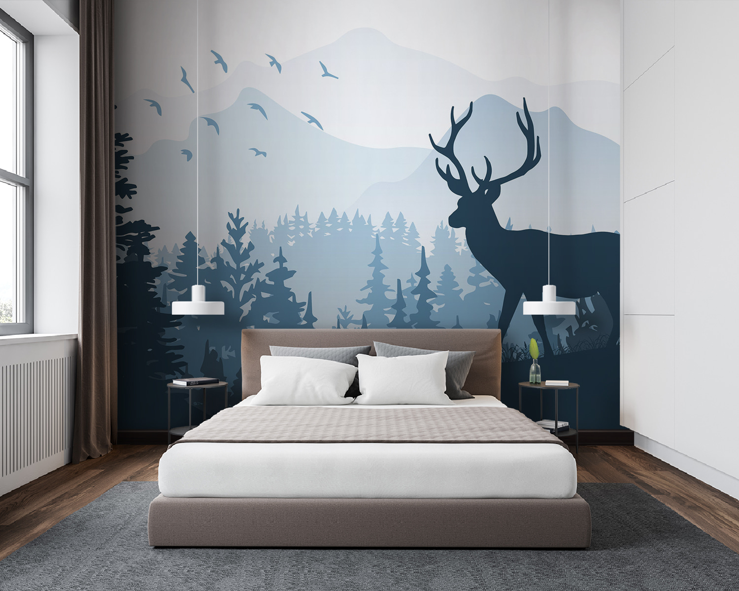 Není tato nástěnná malba prostě úžasná? S názvem “Silueta jeleního paroží” jako byste si přinesli klidný kousek přírody přímo do obývacího pokoje. Představte si, že vás každé ráno vítá tento majestátní jelen uprostřed moře uklidňující modré a zelené – je to jako výjev přímo z pohádkového lesa. Je také součástí několika docela zajímavých kategorií: Pro začátek se můžete podívat na nástěnné malby se zvířaty a designové tapety.