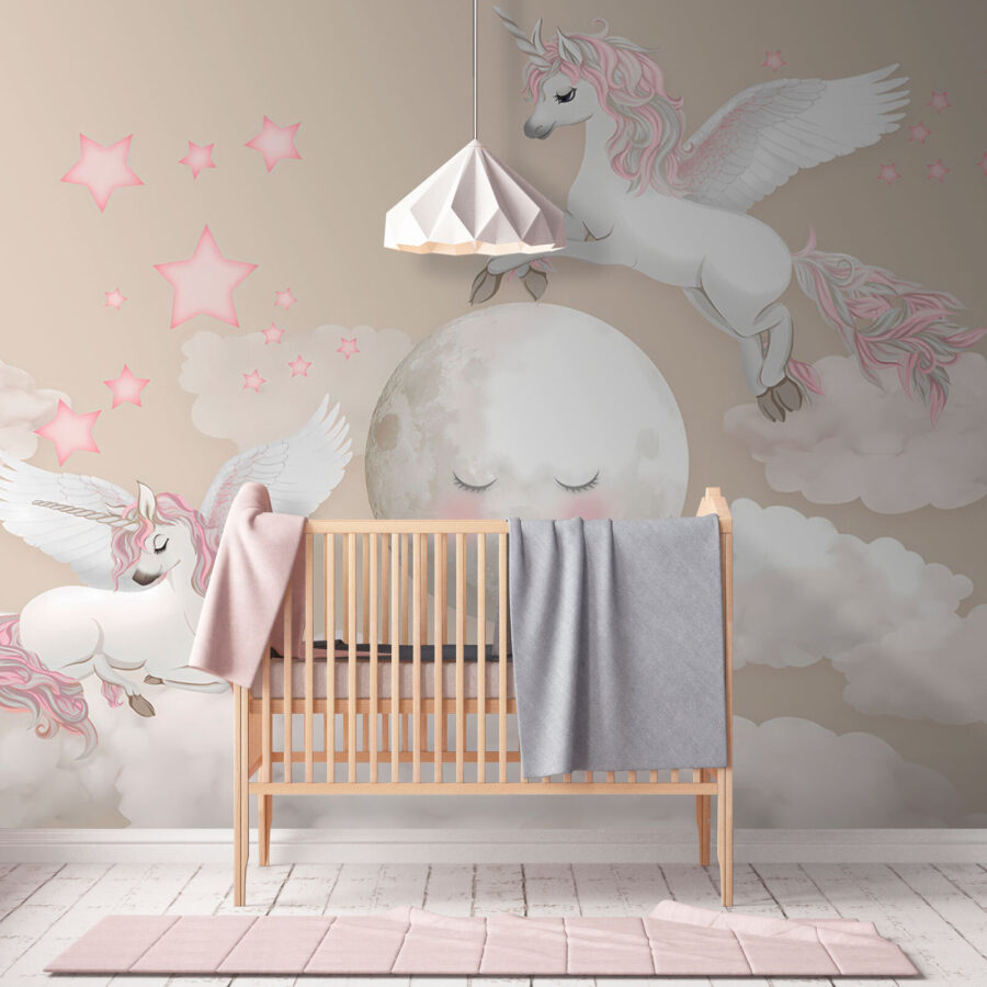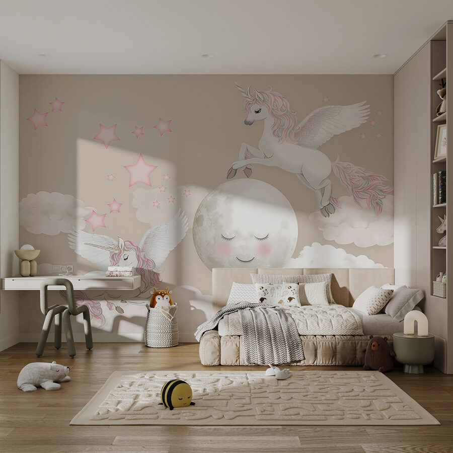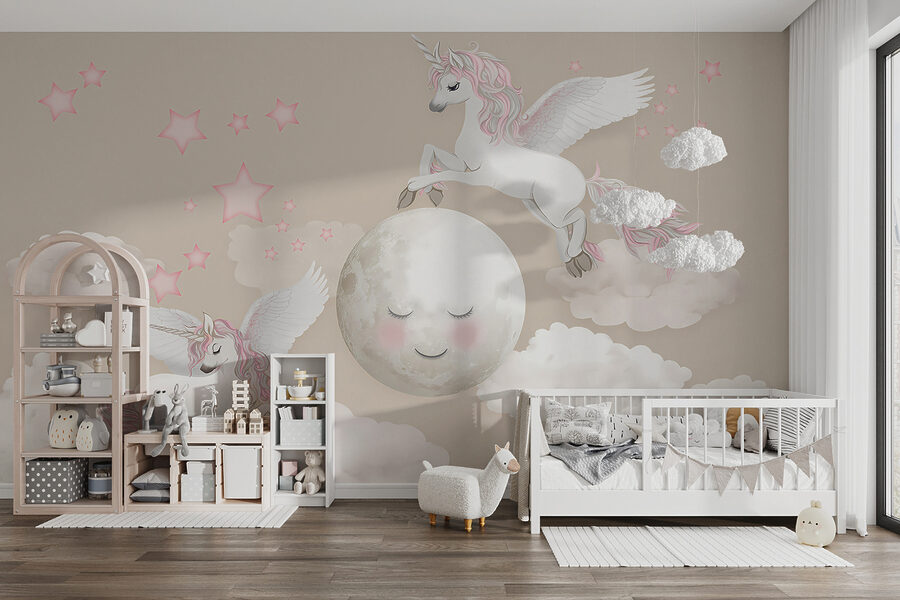 Představte si to: pokoj vašeho dítěte se promění v rozmarnou říši snů díky této rozkošné fototapetě “Jednorožec s křídly a rohem”. Je plná nadýchaných obláčků, třpytivých hvězdiček a těch nejroztomilejších a nejkouzelnějších jednorožců, kteří létají kolem. Celá atmosféra je jemná, snová a jako stvořená pro rozproudění fantazie malého dítěte. Představte si pohádky před spaním pod něžným pohledem těchto kouzelných jednorožců – každý večer se bude zdát jako cesta do daleké pohádkové říše. Je to jako mít kousek kouzla přímo na stěně, který znovu a znovu vytváří okamžiky radosti a úžasu.