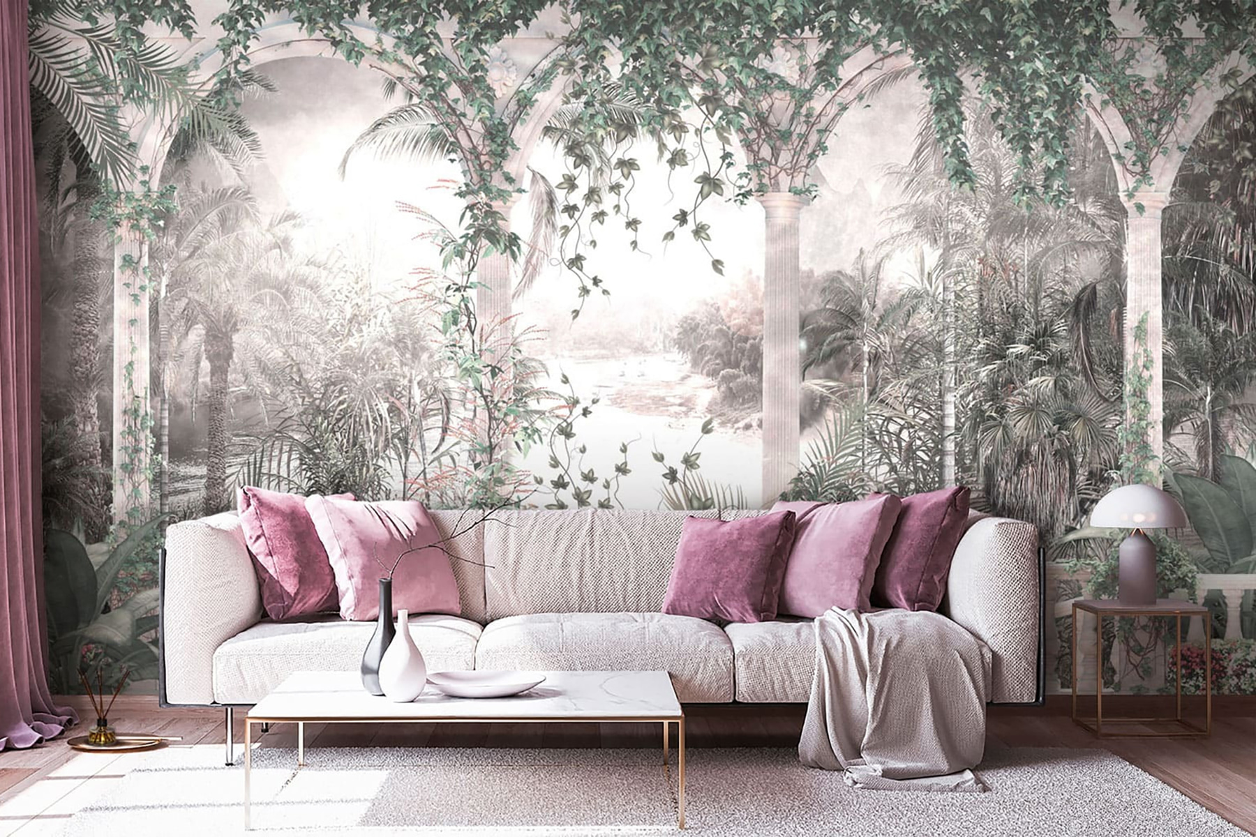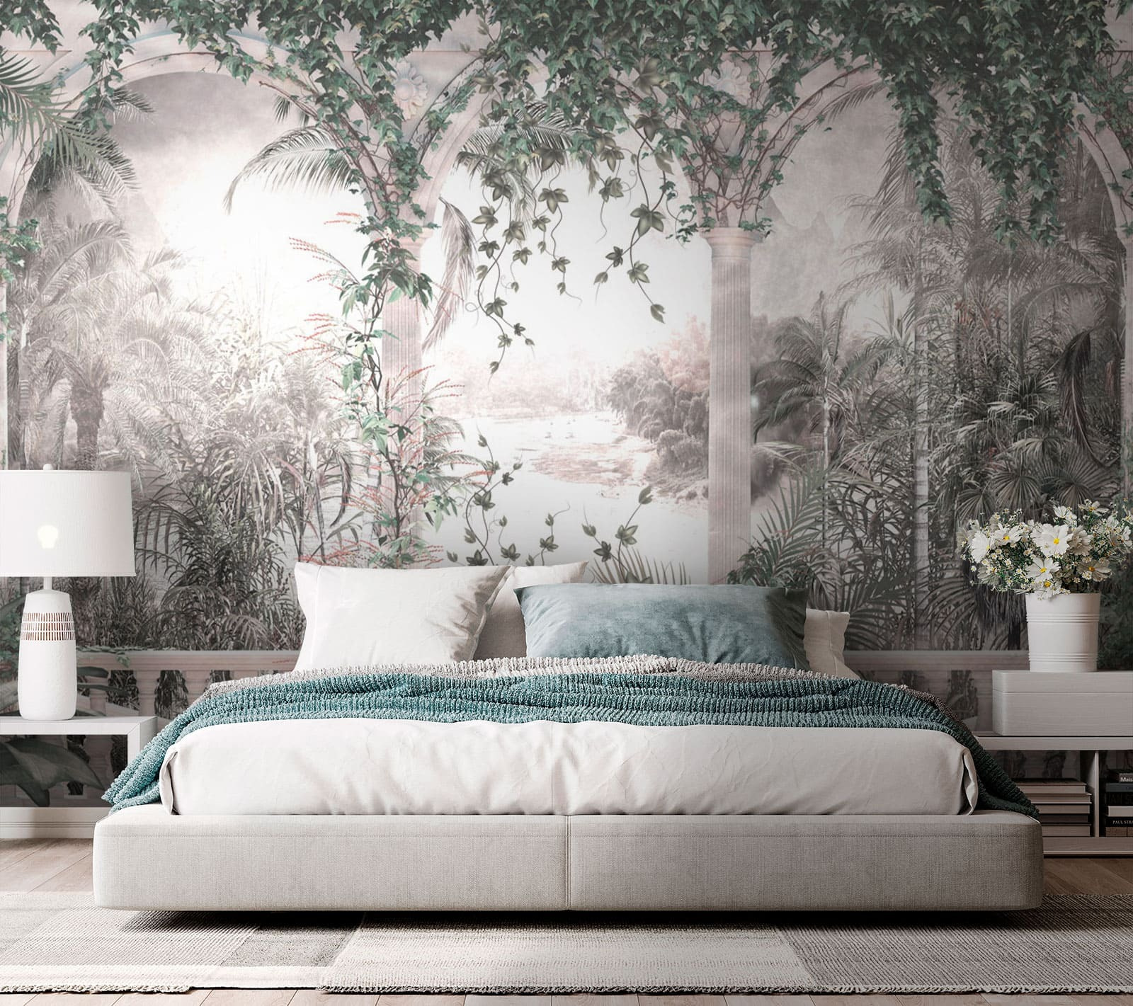 S touto nástěnnou malbou, která zve do vašeho domova bujnou vinnou révu a půvabné oblouky, můžete vstoupit do klidného prostředí. Představte si, jak popíjíte ranní kávu, zatímco sluneční světlo proniká skrz listnatou zeleň a vytváří klidnou atmosféru, která působí osvěžujícím a nadčasovým dojmem. Měkké pozadí naznačuje klidnou krajinu, díky níž snadno zapomenete na okolní svět. Tato nástěnná malba není jen nástěnnou dekorací, je to mini dovolená, která čeká, až se stane. Je ideální pro proměnu nudné místnosti v útulný koutek a dodává jí vrstvu tepla a kouzla, která podněcuje představivost.