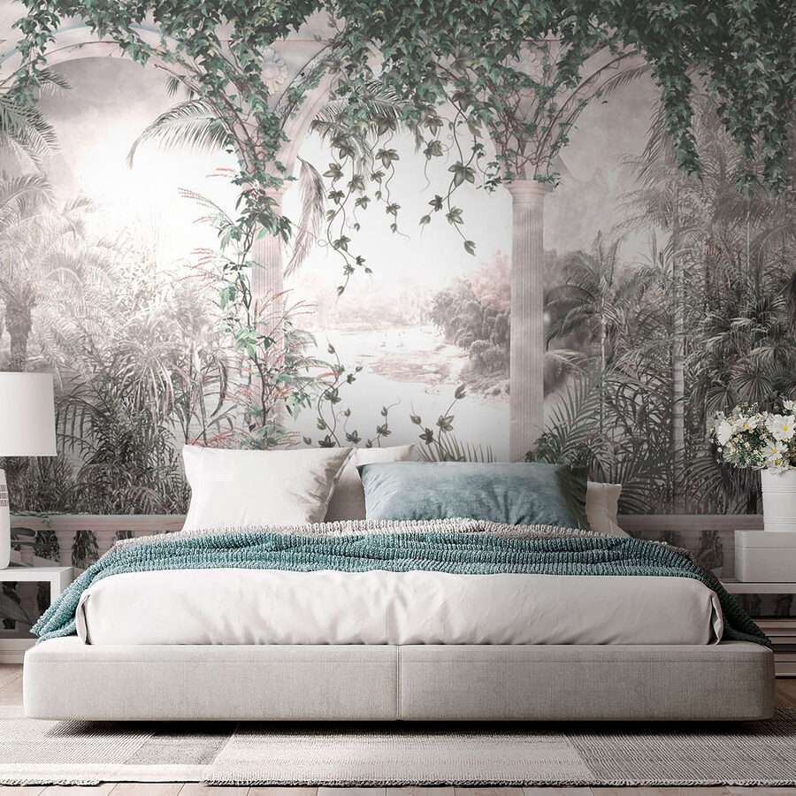 S touto nástěnnou malbou, která zve do vašeho domova bujnou vinnou révu a půvabné oblouky, můžete vstoupit do klidného prostředí. Představte si, jak popíjíte ranní kávu, zatímco sluneční světlo proniká skrz listnatou zeleň a vytváří klidnou atmosféru, která působí osvěžujícím a nadčasovým dojmem. Měkké pozadí naznačuje klidnou krajinu, díky níž snadno zapomenete na okolní svět. Tato nástěnná malba není jen nástěnnou dekorací, je to mini dovolená, která čeká, až se stane. Je ideální pro proměnu nudné místnosti v útulný koutek a dodává jí vrstvu tepla a kouzla, která podněcuje představivost.