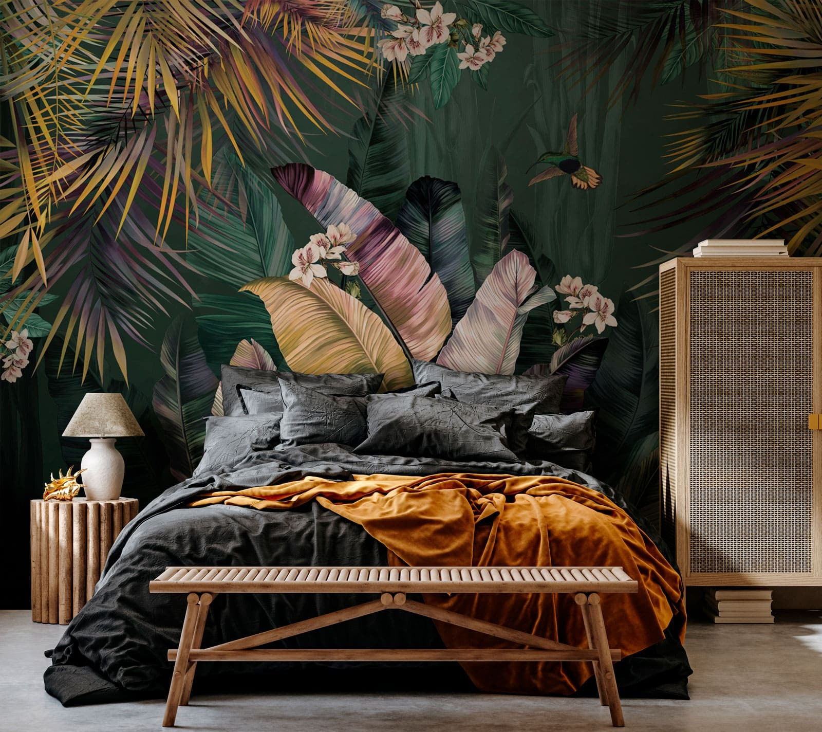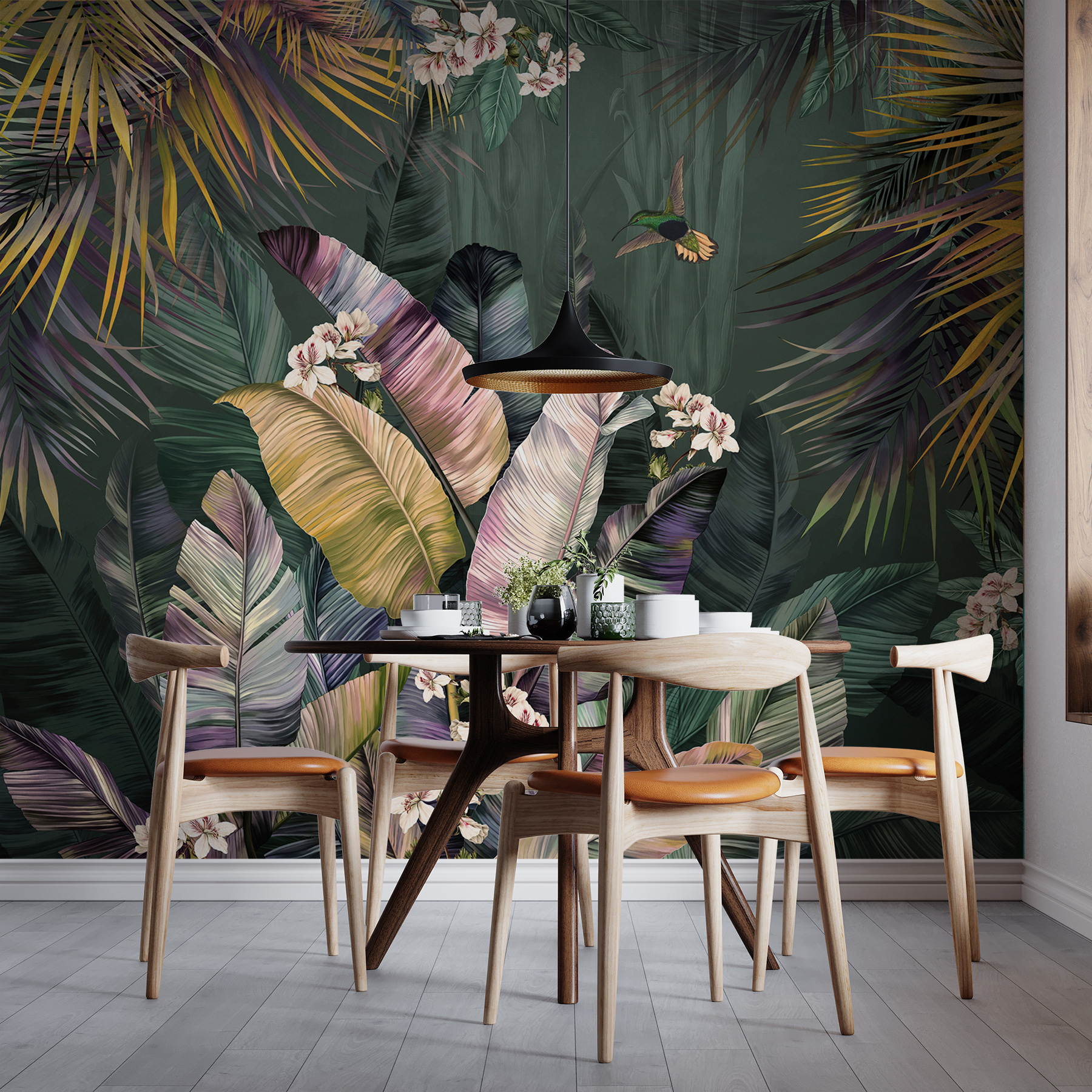 Představte si, že se vracíte domů do svého vlastního tropického ráje s touto úžasnou nástěnnou malbou “Kolibřík létající ve vzduchu” na zdi. Zářivá zeleň, svěží zeleň a náznaky jemných květů vytvářejí atmosféru svěží džungle, díky níž budete mít pocit, že jste vstoupili do klidného deštného pralesa. A ten okouzlující kolibřík, který se třepotá kolem? Dodává mu kouzlo – jako drobný, radostný tanec přírody přímo ve vašem obývacím pokoji.