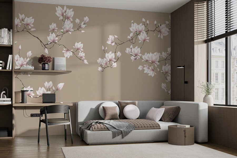 Proměňte svůj prostor pomocí okouzlující nástěnné malby Kvetoucí větve magnólie v pastelových barvách! Představte si, že vstoupíte do místnosti, kde se po stěnách rozprostírají jemné květy magnólie, které okamžitě zvednou náladu. Jemná pastelová paleta našeptává teplo a klid, což je ideální pro útulný čtecí koutek nebo i živý obývací prostor.