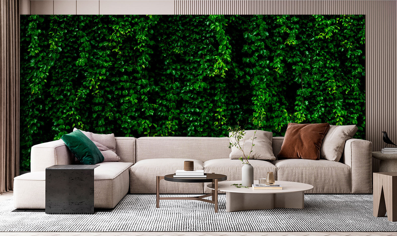 Fototapeta Zářivě zelené listí na pozadí stěny Fototapeta Zářivě zelené listí na pozadí stěny
