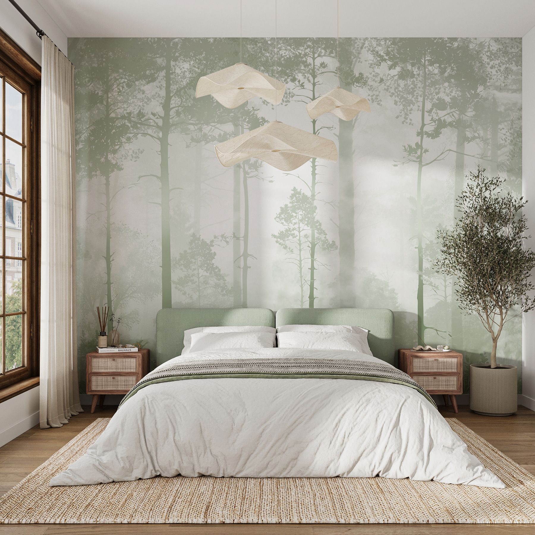 S touto nástěnnou malbou mlžného lesa proměníte každou místnost v klidné útočiště. Představte si, že se probudíte s klidným pohledem na vysoké stromy zahalené v mlze, jako byste vstoupili do uklidňujícího snu. Není to jen obklad na zeď, je to výzva k vdechování čerstvého lesního vzduchu, i když zrovna popíjíte kávu v kuchyni. Představte si útulný čtecí koutek obklopený touto klidnou kulisou – naprosto ideální pro schoulení se do klubíčka s dobrou knihou. A hele, kdo by nechtěl, aby se jeho prostor cítil trochu kouzelněji? Díky tlumené zelené a jemným vzorům je to, jako by se příroda právě rozhodla, že se zdrží ve vašem obývacím pokoji. Ideální pro chvíle, kdy vám život připadá příliš chaotický. Nechte tuto nástěnnou malbu vnést do svého domova trochu klidu.