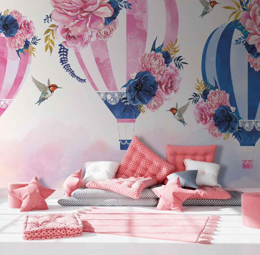 Proměňte svůj prostor pomocí této snové tapety s motivem skupiny horkovzdušných balónů zdobených krásnými květinami. Představte si, že vstupujete do místnosti, která působí, jako by se vznášela na jemném vánku, kde každý balón přináší záblesk barev a fantazie. Jemné odstíny a delikátní květy vytvářejí klidnou atmosféru, ideální pro útulný koutek na čtení nebo veselý dětský pokoj. A ty malé kolibříky? Jsou rozkošné! Je to, jako by příroda a umění vedly příjemný rozhovor a vy si můžete vychutnat jejich mistrovské dílo. Kdo by se při pohledu na něj necítil o něco lehčí? Ideální pro ty, kteří věří, že v každém koutě vašeho domova může být trocha magie!
