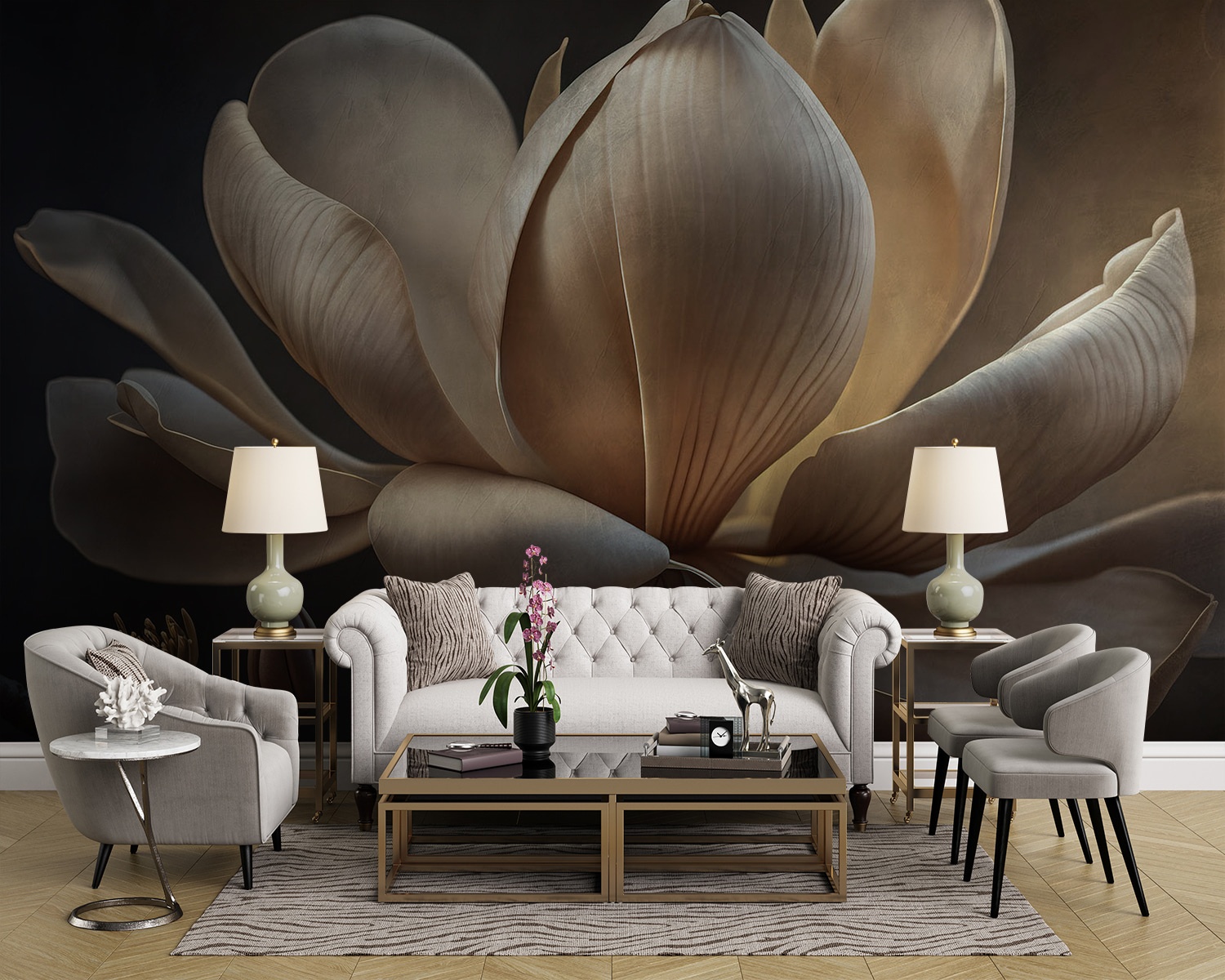 S touto nástěnnou malbou s jemnými magnóliemi, které se vyhřívají v měkkém světle, proměníte každou místnost v klidné útočiště. Představte si, že vstoupíte do svého prostoru a přivítá vás uklidňující elegance těchto krásných květů – je to jako přenést zahradu do interiéru. Ideální pro útulný čtecí koutek nebo prázdnou stěnu, která prostě potřebuje trochu lásky. Tlumené tóny vytvářejí uklidňující atmosféru, takže je těžké si oddechnout. A hele, skoro slyšíte šumění listí nebo jemné šumění přírody. Je to malý dotek kouzla, který do vašeho každodenního života našeptává teplo. Není příjemné mít každodenní připomínku krásy přírody přímo u sebe doma?