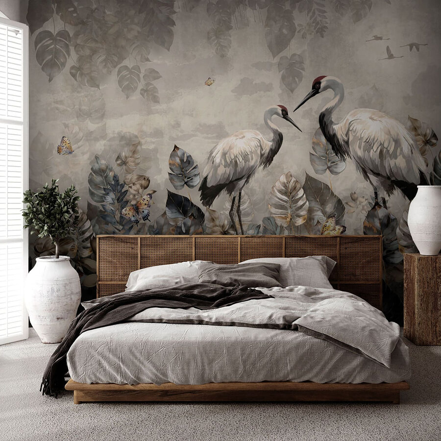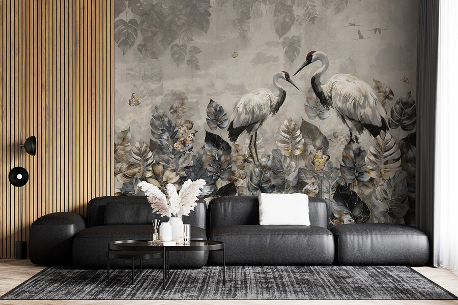 Představte si, že se probudíte, protáhnete se a vychutnáte si klidný pohled na dva jeřáby, z nichž jeden drží rybu, přímo na vaší zdi. Tato nástěnná malba je víc než jen dekorace; je to jako mít v interiéru kousek přírodní poezie. Tančí mezi náladovou modří a zemitou šedí, s těmi motýly třepotajícími se kolem listů, které vypadají, jako by je políbil pozdní podzim.
