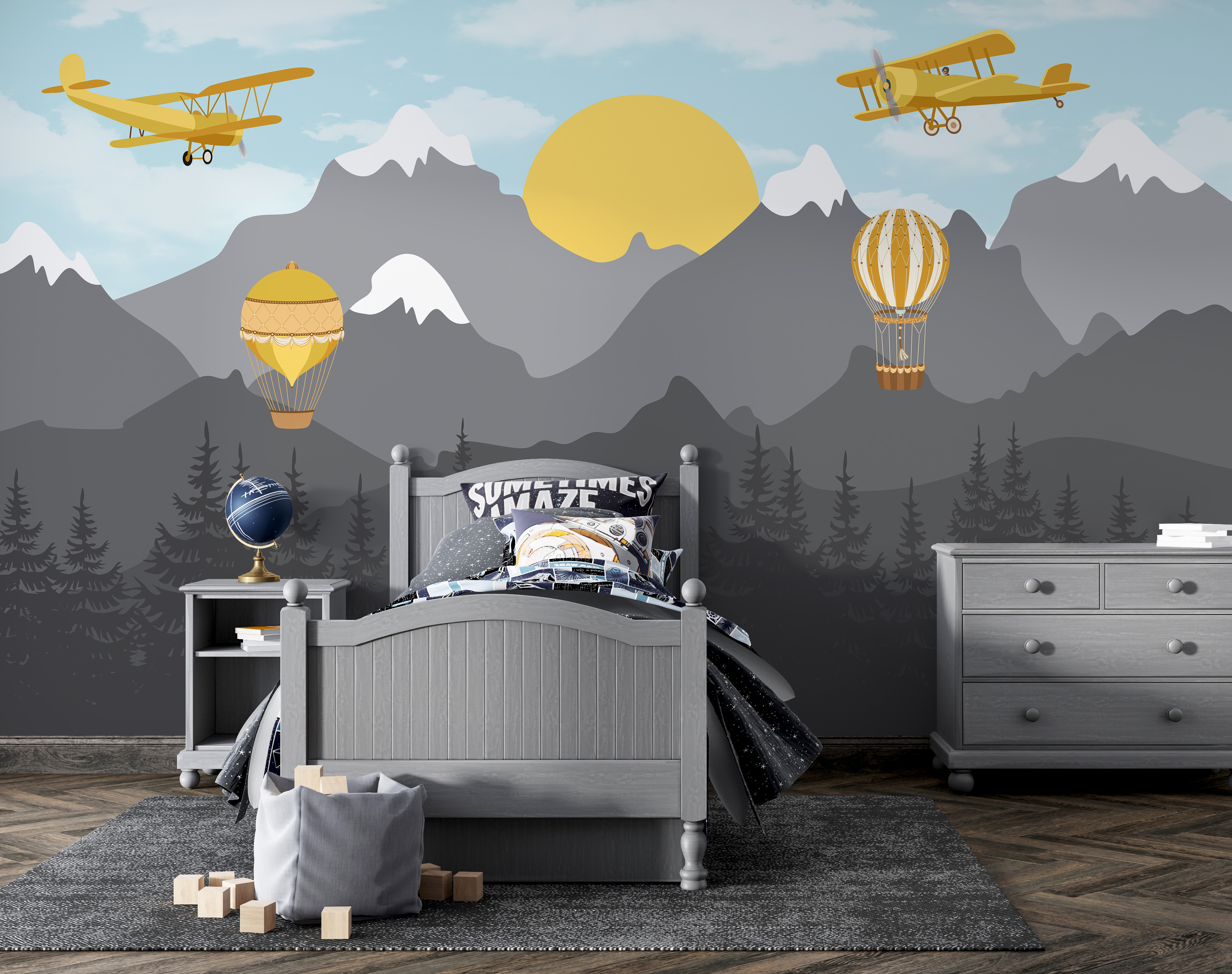 Proměňte dětský pokoj v rozmarné nebeské dobrodružství s touto nádhernou nástěnnou malbou se žlutým letadlem vznášejícím se nad majestátními horami a hravými horkovzdušnými balóny. Představte si to vzrušení, když se děti dívají vzhůru a sní o vzdálených zemích a vzrušujícím letu. Jemná modrá a tlumená šedá vytvářejí uklidňující pozadí, zatímco veselá žlutá barva upoutá pozornost – a vyvolá radost. Pověste si ho do ložnice nebo do dětského koutku a sledujte, jak se fantazie vznáší na křídlech! Je to jako mít v interiéru kousek oblohy – jen možná ne se skutečnými mraky. Ideální pro dobrodružné duše!