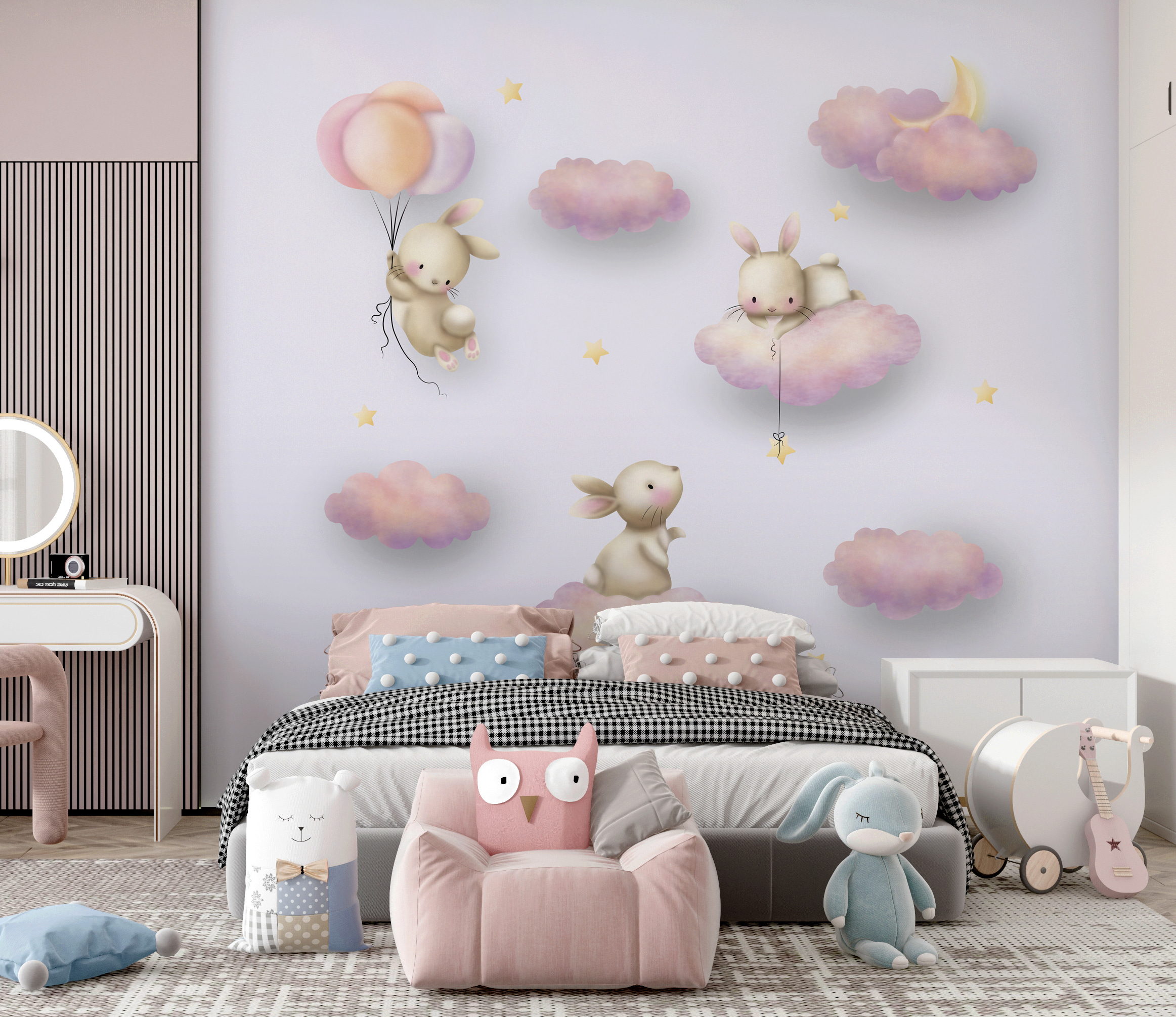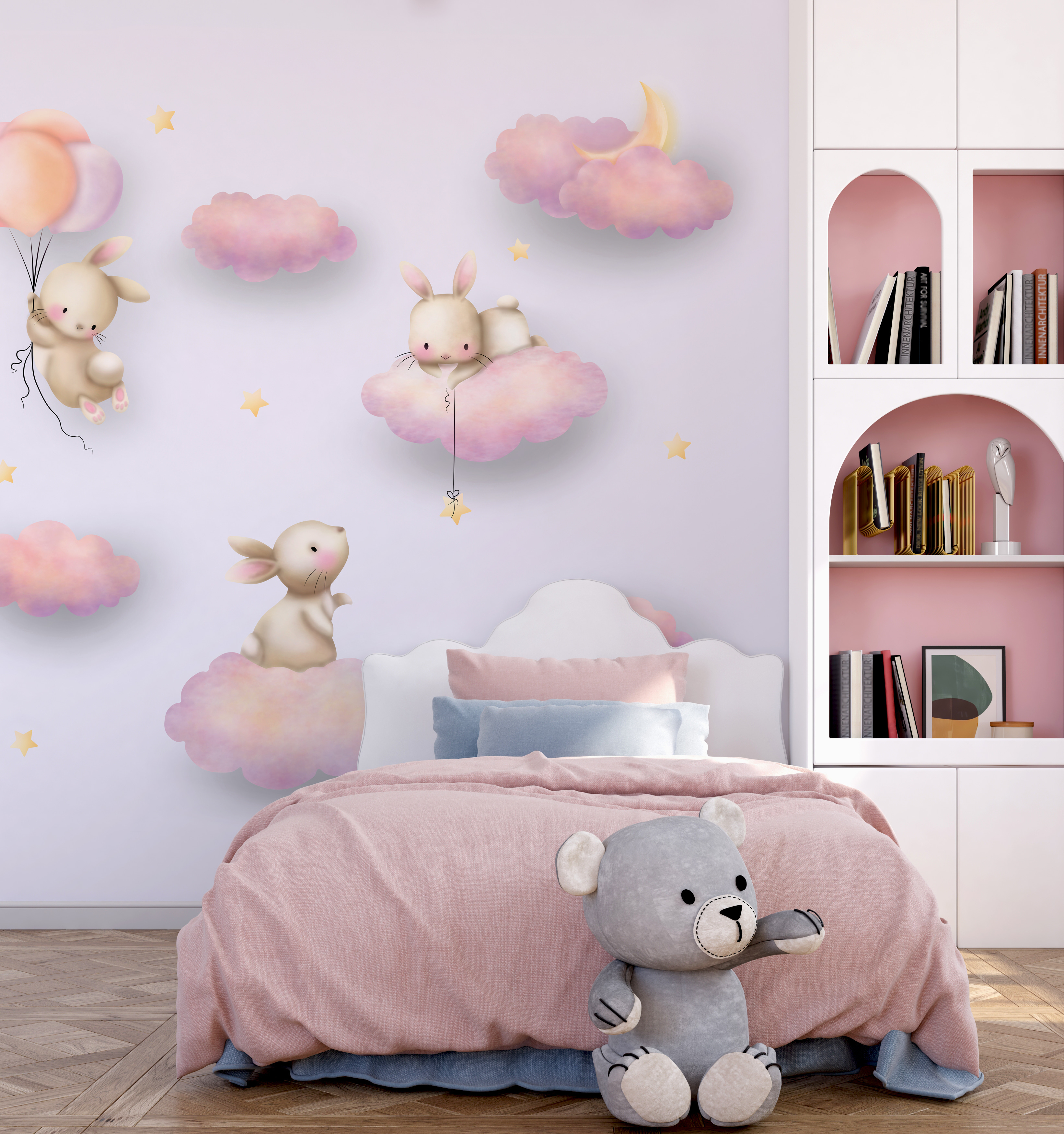 Transform any space into a dreamy haven with this delightful mural featuring a whimsical group of rabbits floating on clouds. Imagine these fluffy little friends suspended in a pastel sky, each one adding a playful charm. Perfect for a nursery or kid’s room, this mural promises to spark joy and imagination. Picture bedtime stories coming alive against this backdrop, or maybe even daydreaming under the soft colors. Whether it’s a cozy corner or a playroom, it brings that heartwarming, magical touch that makes everyone feel a bit lighter. Who wouldn’t smile at a bunny holding balloons? It’s like a gentle reminder to keep dreaming, even when life gets busy.