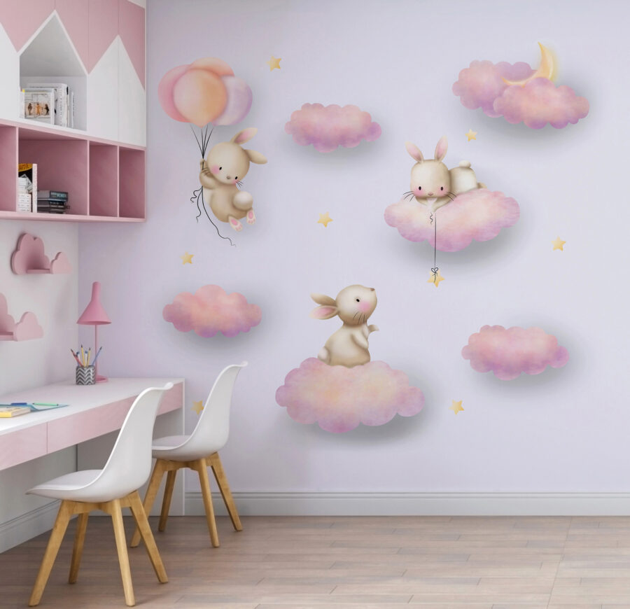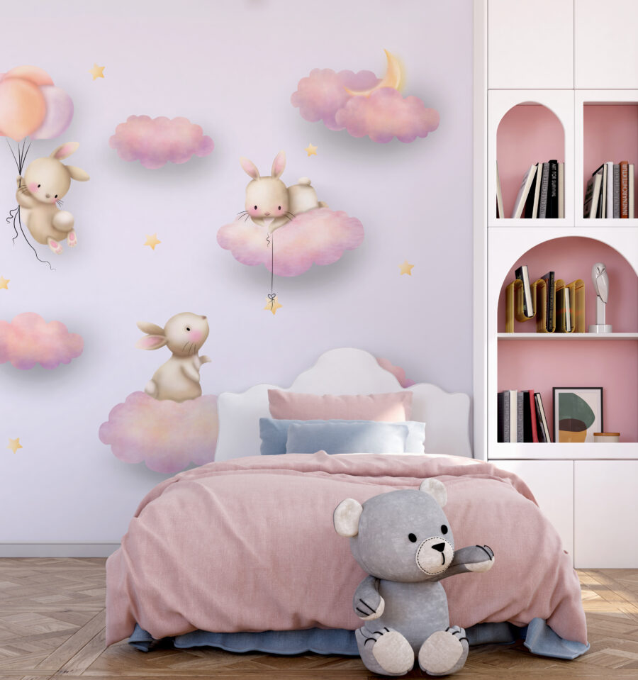 Proměňte jakýkoli prostor v pohádkovou oázu s touto nádhernou tapetou, na které je vyobrazena skupina roztomilých králíčků plovoucích na obláčcích. Představte si tyto chlupaté kamarády vznášející se na pastelově zbarvené obloze, z nichž každý dodává místnosti hravý šarm. Tato tapeta je ideální do dětského pokoje a zaručeně roznítí radost a fantazii. Představte si, jak ožívají pohádky na dobrou noc na tomto pozadí, nebo jak se sní pod jemnými barvami. Ať už se jedná o útulný koutek nebo hernu, přináší to hřejivý, magický dotek, díky kterému se všichni cítí o něco lehčeji. Kdo by se neusmál na králíčka držícího balónky? Je to jako jemné připomenutí, že je třeba dál snít, i když je život rušný.