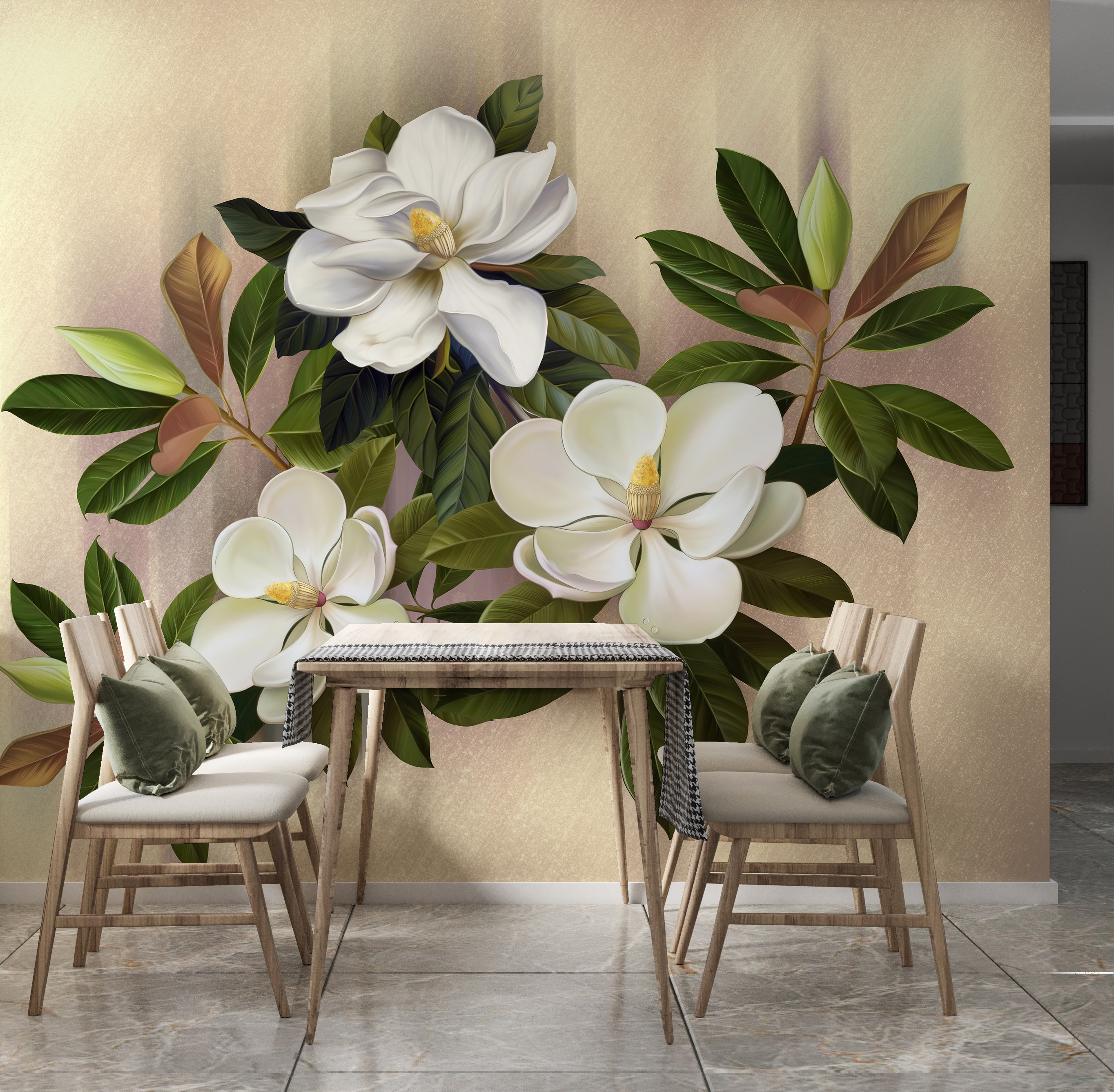 Proměňte jakýkoli pokoj v živou oázu s tapetou „Elegantní květy s bujnými zelenými listy“. Představte si, že vstoupíte do svého obývacího pokoje a přivítají vás tyto nádherné bílé květiny, které si doslova říkají o druhý pohled. Je to jako přivést si zahradu dovnitř – bez otravného hmyzu! Ideální pro útulný koutek na čtení nebo prázdnou zeď, která zoufale potřebuje příběh.