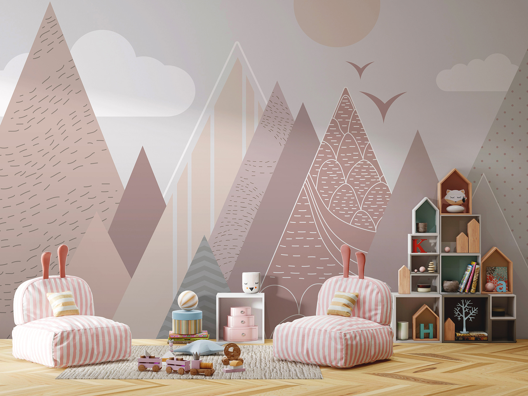 Představte si, že vejdete do místnosti a okamžitě pocítíte klid a rozmar – něco jako útulné snění. Nástěnná fototapeta “Geometrické hory s poletujícími ptáky” přesně tohle dokáže. Díky hravým pastelovým horám a přátelským létajícím ptákům vnese do každého dětského pokoje milou a klidnou atmosféru. Skvěle se hodí do dětských pokojů a dětských pokojíčků, kde rozprašuje trochu kouzla, aniž by byla příliš výrazná.