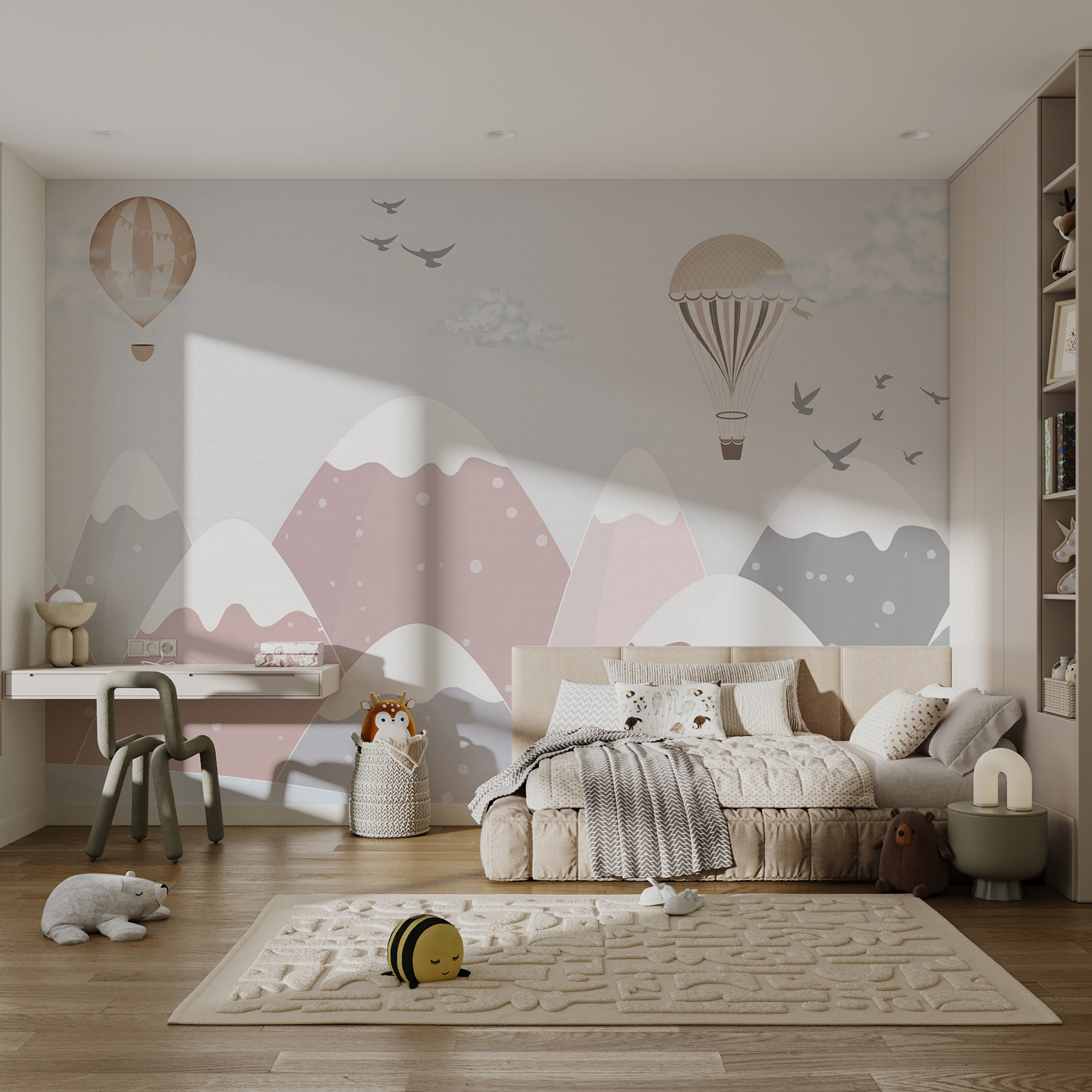 Dokážete si pod touto freskou představit pohádky na dobrou noc? Vyprávění příběhů o cestách horkovzdušným balonem nad horami. Má tento nadčasový, klasický vzhled, ale s jemným, moderním nádechem. Ne nadarmo je právě v těchto “oblíbených nástěnných malbách”. Prostě rozzáří prostor šarmem a teplem.
