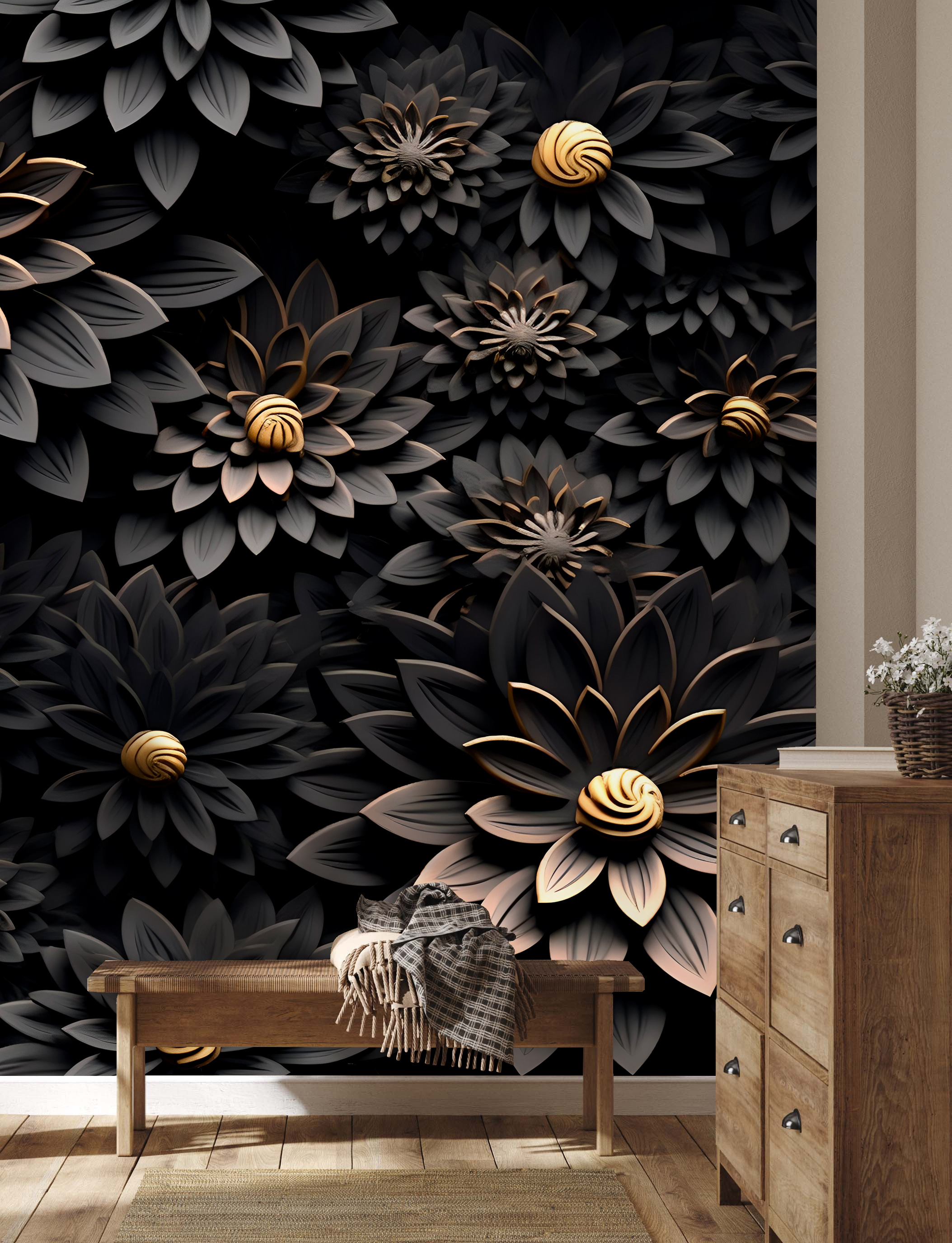 Proměňte svůj prostor pomocí této úžasné nástěnné malby s kovovými květinami na tmavém pozadí. Je to jako přenést kousek kouzelné zahrady do interiéru – ideální pro rozproudění konverzace nebo jen snění během líného odpoledne. Představte si to: jste schoulení s dobrou knihou a krása těchto květů vás obklopuje v útulném objetí. Květinové vzory vynikají na pozadí hlubokých tónů a dodávají každé místnosti zajímavou hloubku. Není to jen dekorace, je to zážitek. Představte si, že přátelé vejdou dovnitř, usmějí se a okamžitě pocítí tu krásnou atmosféru. Tato nástěnná malba, která je dokonalou kombinací elegance a nádechu dramatu, dokáže proměnit jakoukoli stěnu ve výjimečný kousek a radostné útočiště.