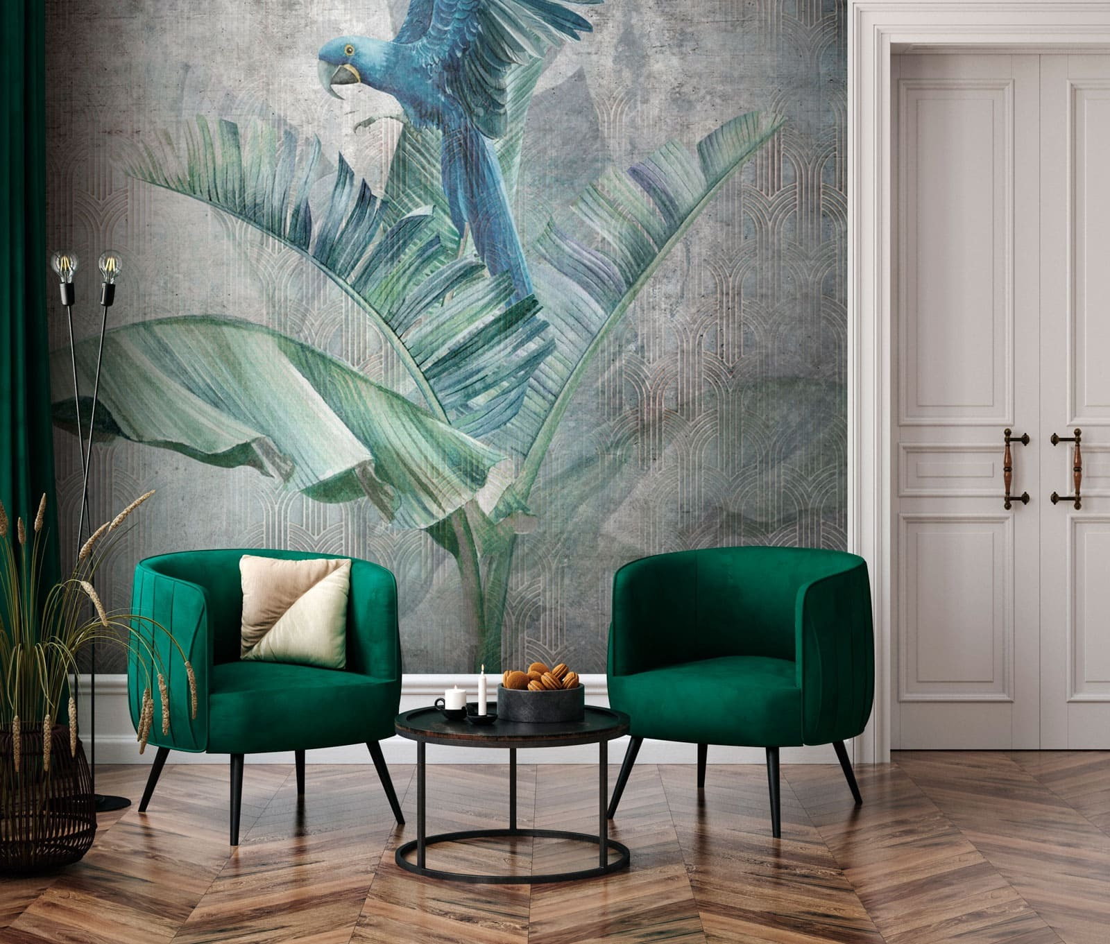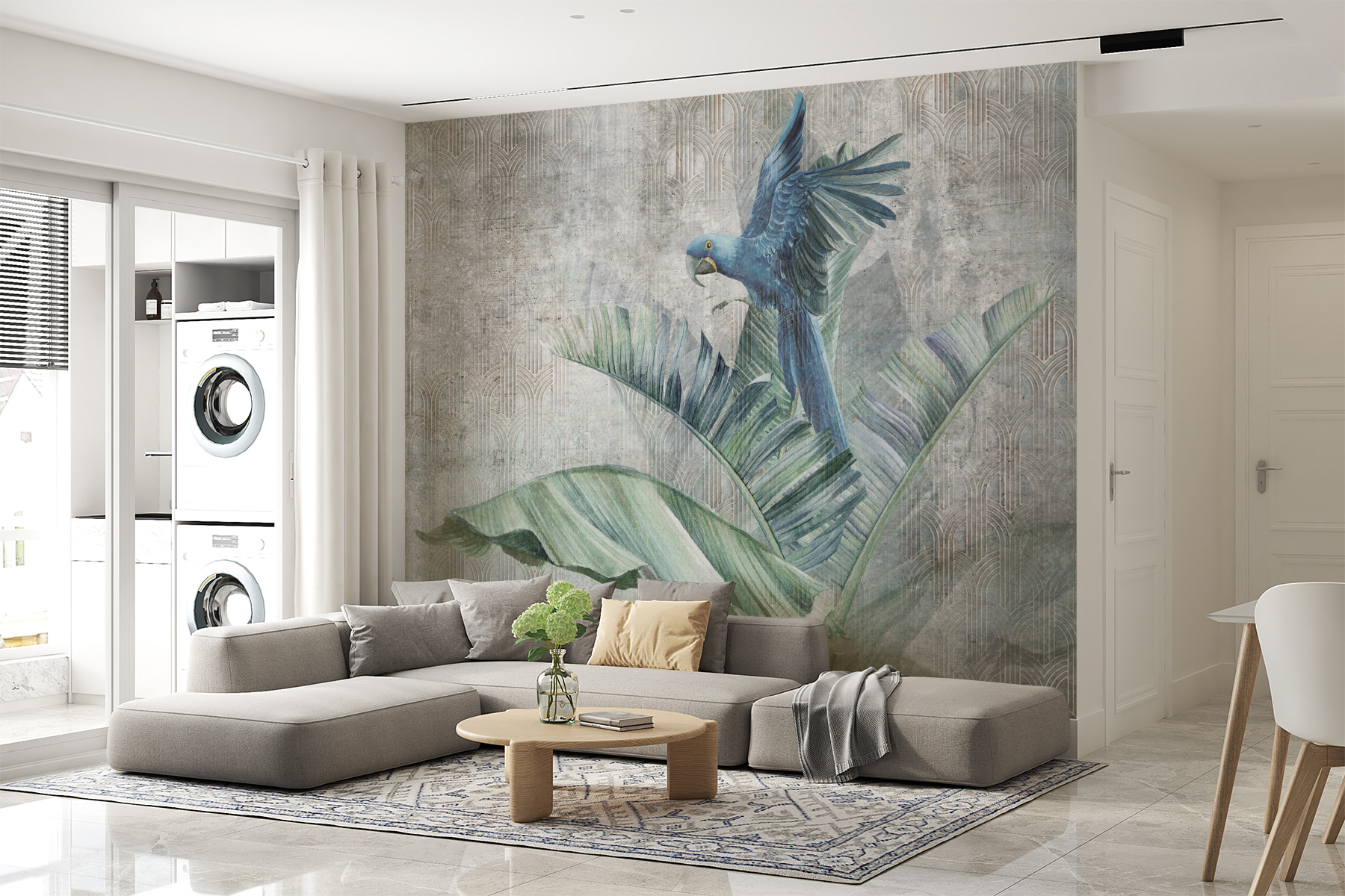Představte si, že vejdete do obývacího pokoje a přivítá vás úžasný modrý papoušek sedící na svěžích listnatých větvích. Tato nástěnná malba je víc než jen dekorace – je to tropický únik. Zářivě modrý papoušek vyniká na pozadí uklidňující zeleně, takže se váš prostor bude cítit jako oáza deštného pralesa. Je ideální pro každého, kdo miluje ptáky nebo jen potřebuje do svého života trochu více přírody. Představte si ho ve své jídelně, kde dodá svěží atmosféru vaší ranní kávě nebo hostům u večeře, kteří doplní váš jedinečný styl. Navíc má ten správný nádech elegance díky palmovým listům, které rámují scénu. Proč se spokojit s obyčejnými stěnami, když můžete mít umělecké dílo, které vás každý den přenese do tropického ráje?