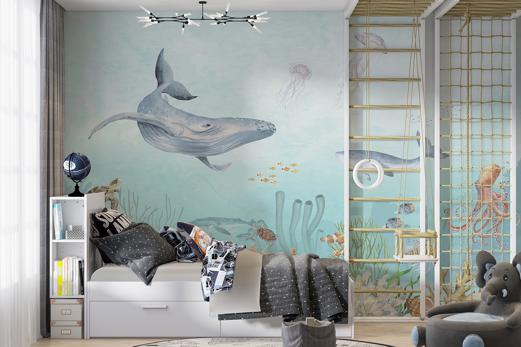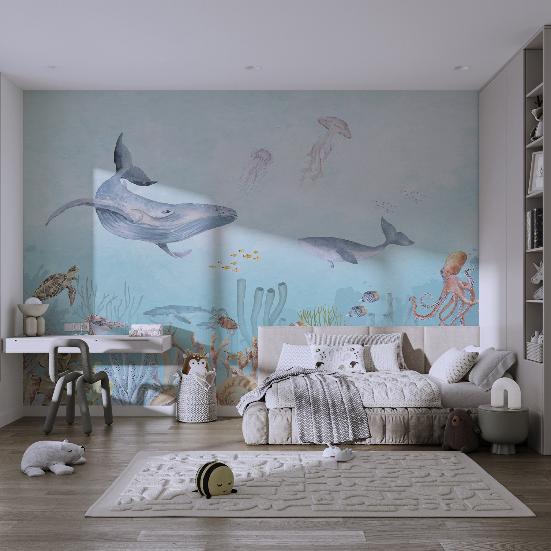 Ponořte se do moře zázraků s touto podmanivou nástěnnou malbou “Podmořský život”! Představte si, jak se obyčejný pokoj promění v oceánskou oázu plnou hravých mořských tvorů a živých korálových útesů. Tato fototapeta, která je ideální pro rozvíjení představivosti dětí i kojenců, přinese kouzlo hluboké modři přímo k vám domů. Je tu obří velryba – a podívejte! Malá skupinka klaunů, kteří si hrají na schovávanou v sasankách. Ať už se nachází v dětském pokoji vašeho dítěte nebo v rozmarné koupelně, okamžitě dodá šmrnc dobrodružství a klidu. Neslyšíte téměř tiché šumění vody a jemné šplouchání chapadel chobotnice? Nainstalujte si ji do svého prostoru a sledujte, jak se oči rozšiřují nadšením (a možná se i trochu zachichotáte). Je to víc než jen nástěnná malba, je to podvodní eskapáda bez namočení – tak do toho, udělejte si radost!