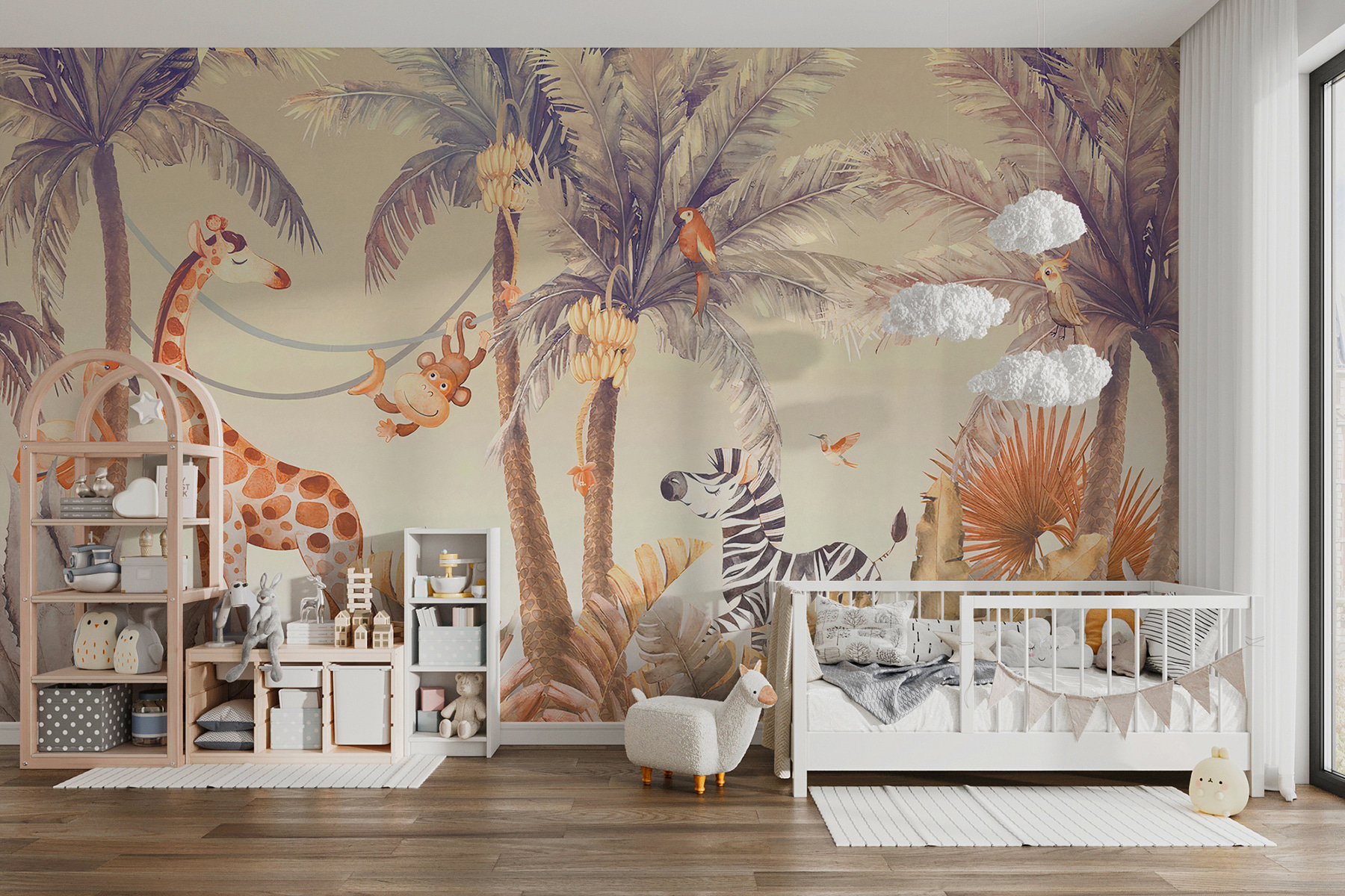 Představte si, že vejdete do místnosti a přivítá vás večírek v džungli! Tato nástěnná fototapeta s živou posádkou zvířat, která se vyhřívají na slunci, vnese pocit dobrodružství přímo do vašeho domova. Veselá opice se houpe v útulné houpací síti vedle přátelské žirafy, zatímco zebra a plameňák se přidávají k zábavě. Jako by se džungle rozhodla uspořádat malou oslavu slunečních paprsků a vy jste zváni! Tato nástěnná malba je ideální do dětských pokojů – jen si představte jiskru v jejich očích a nápadité příběhy, které se mohou odehrát. Je to víc než jen dekorace, je to vstupenka na hravé dobrodružství každý den. Čeká na vás šplouchnutí barev, špetka rozmarnosti a spousta radosti!
