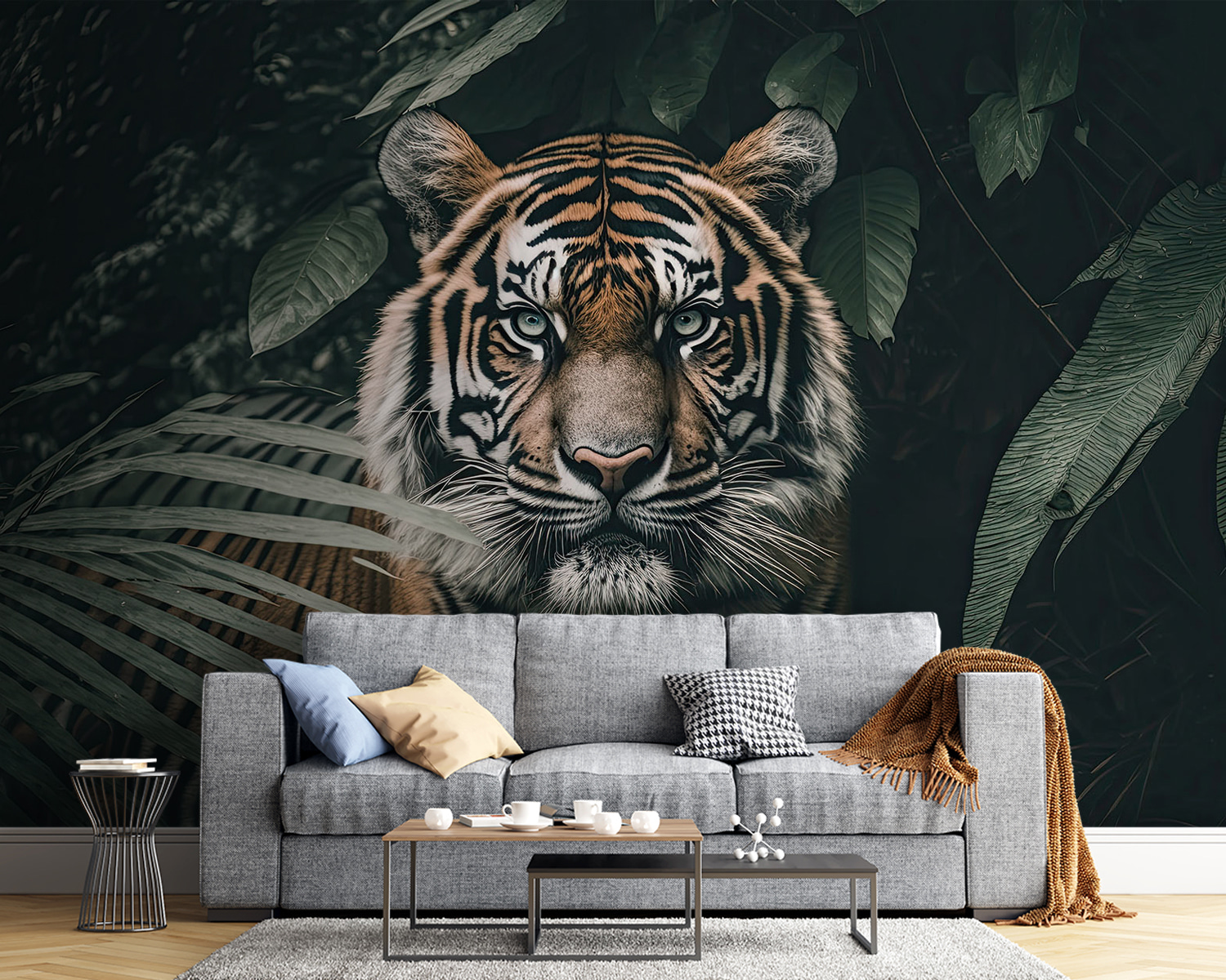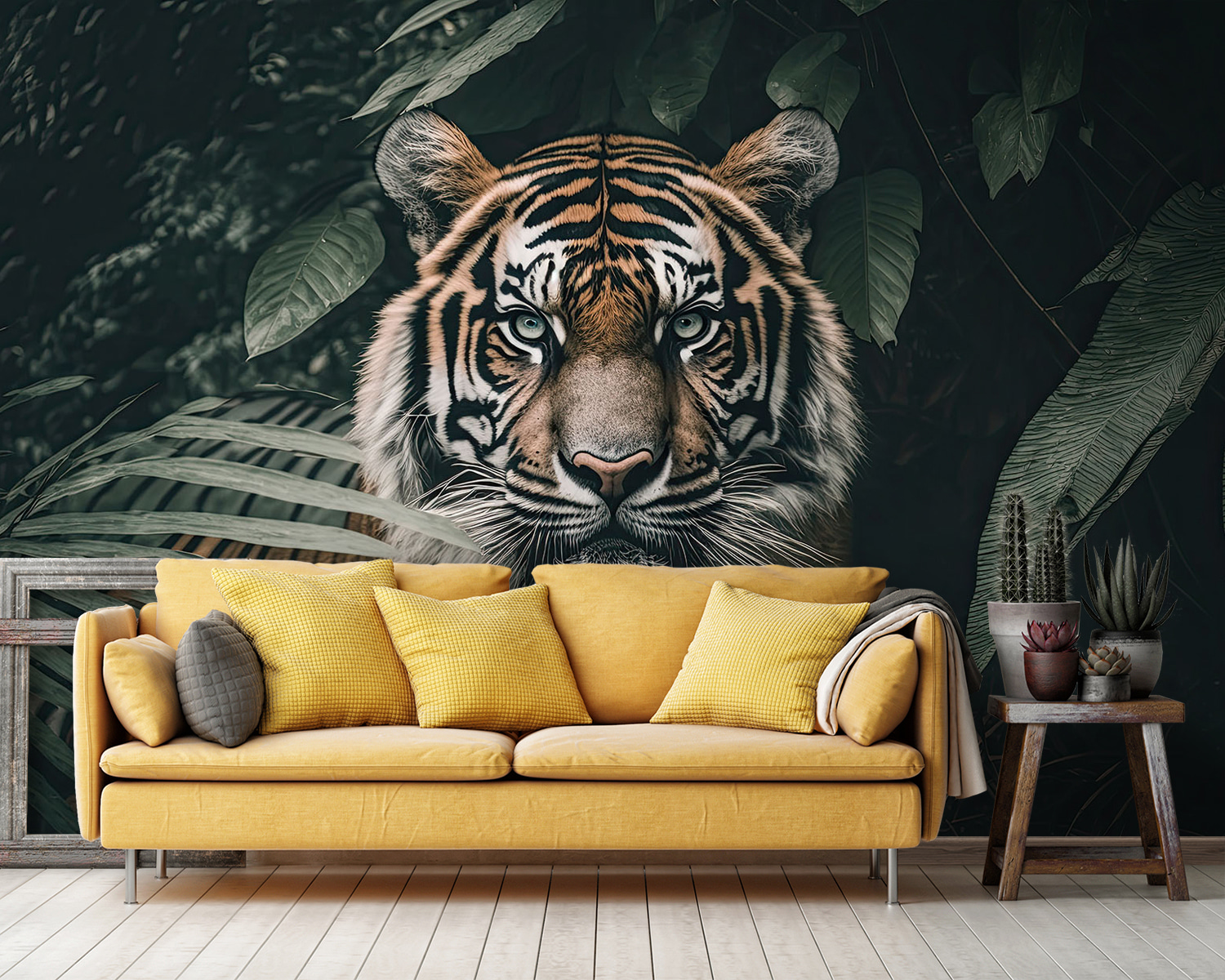 Proměňte svůj prostor pomocí této úžasné nástěnné malby s tygrem vykukujícím skrz svěží džungli. Je to jako divoké dobrodružství přímo u vás doma! Představte si, že vejdete do místnosti, kde na vás toto majestátní zvíře jako by dohlíželo a vyvolalo ve vás pocit úžasu a malého vzrušení. Díky sytě zelené a výrazné oranžové barvě se obraz skvěle hodí na jakoukoli stěnu – promění všední prostor v exotickou oázu. Představte si útulné večery, popíjení čaje a zároveň pocit, že jste vstoupili do objetí přírody. Tato nástěnná malba nejen zdobí, ale vypráví příběh, který vybízí každého návštěvníka, aby se zastavil a nasál ho. Ideální pro ty, kteří rádi utíkají od všednosti!