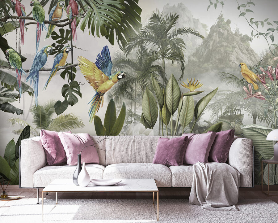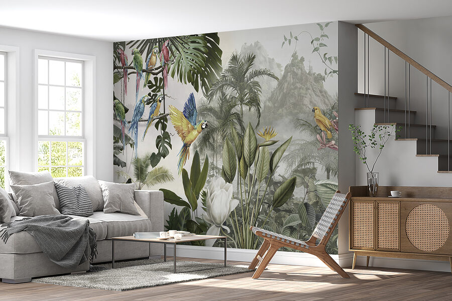Proměňte jakoukoli stěnu v živou únikovou cestu pomocí této úžasné nástěnné malby barevných papoušků v letu. Představte si, že vejdete do místnosti, kde tito opeření přátelé jako by poletovali přímo vzduchem a každé jejich zakrákání evokuje kouzlo tropického ráje. Je to jako přenést si kus přírody dovnitř, bez vlhkosti. Díky svěžímu listí a živým květům se cítí jako živý a vytváří tuto snovou kulisu, která vyvolává radost a teplo.