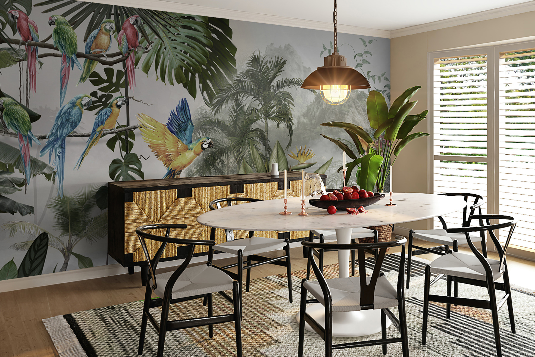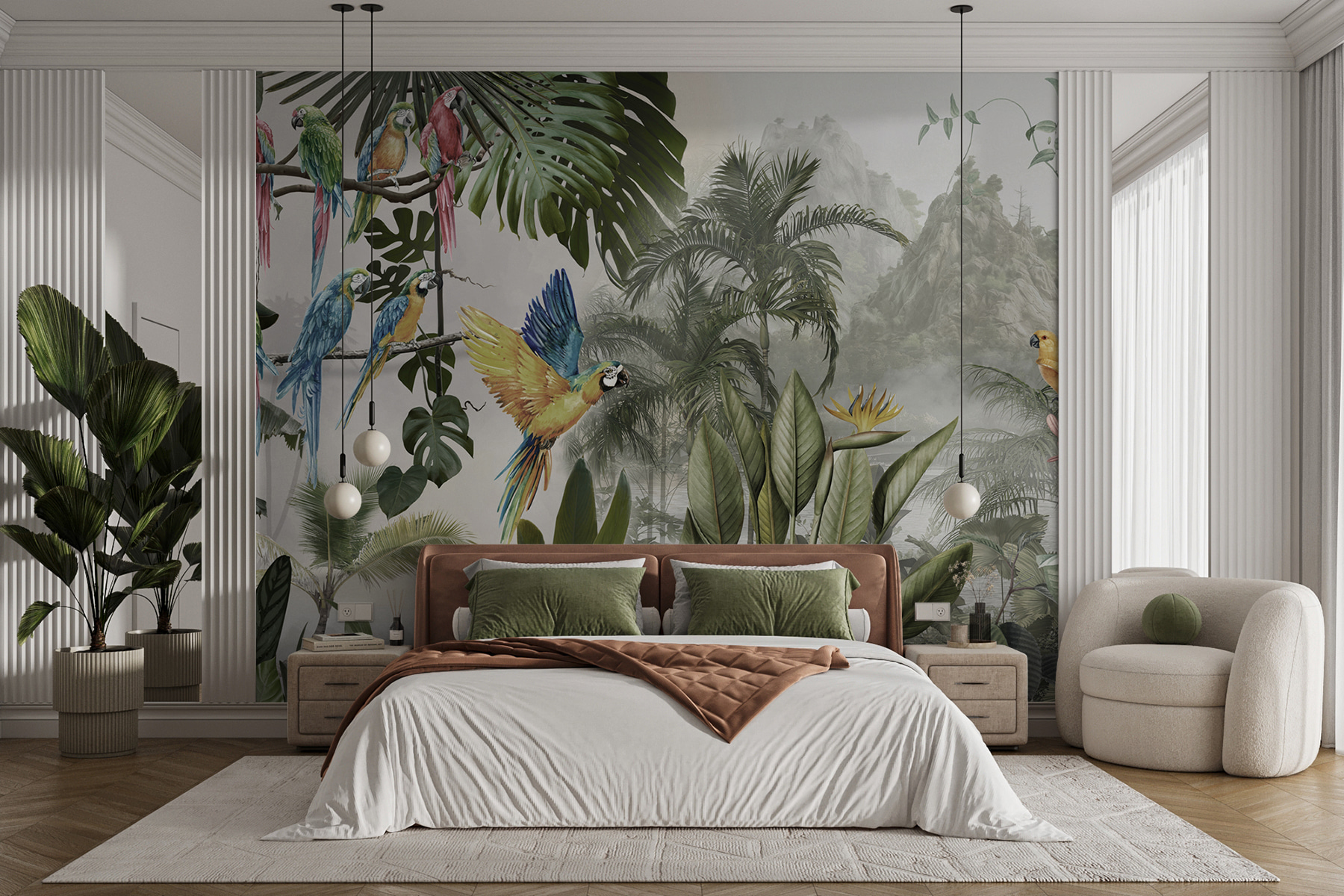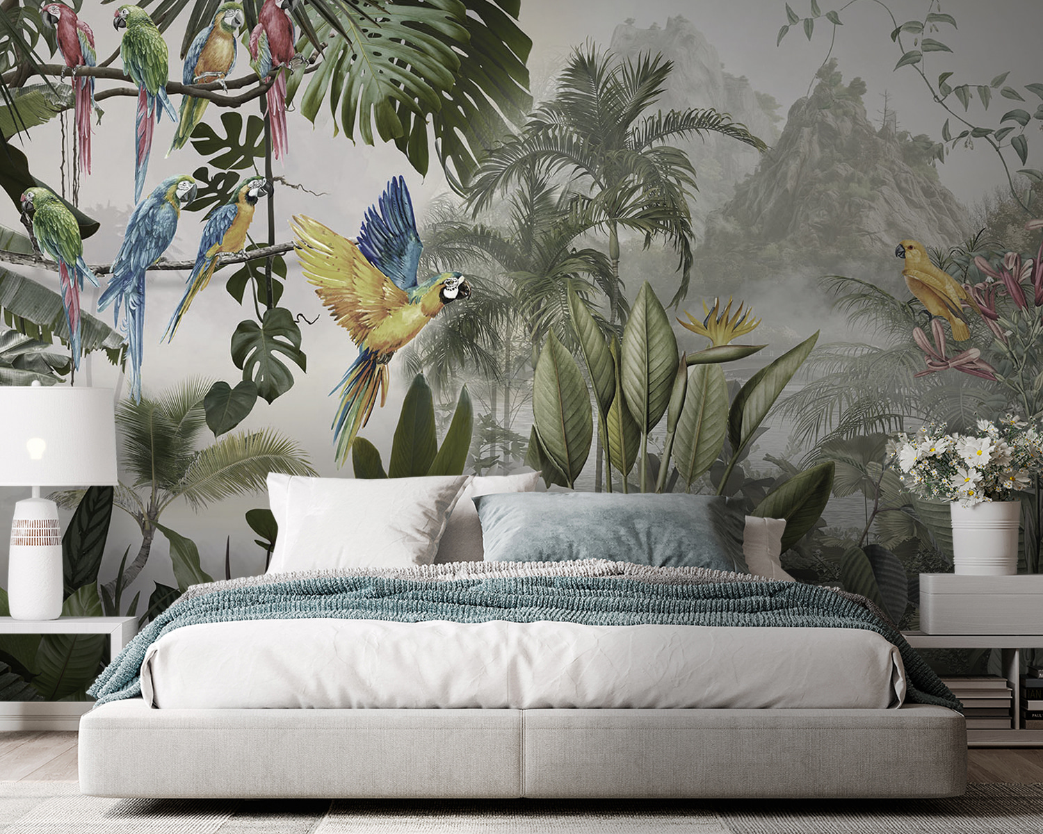 Proměňte jakoukoli stěnu v živou únikovou cestu pomocí této úžasné nástěnné malby barevných papoušků v letu. Představte si, že vejdete do místnosti, kde tito opeření přátelé jako by poletovali přímo vzduchem a každé jejich zakrákání evokuje kouzlo tropického ráje. Je to jako přenést si kus přírody dovnitř, bez vlhkosti. Díky svěžímu listí a živým květům se cítí jako živý a vytváří tuto snovou kulisu, která vyvolává radost a teplo.