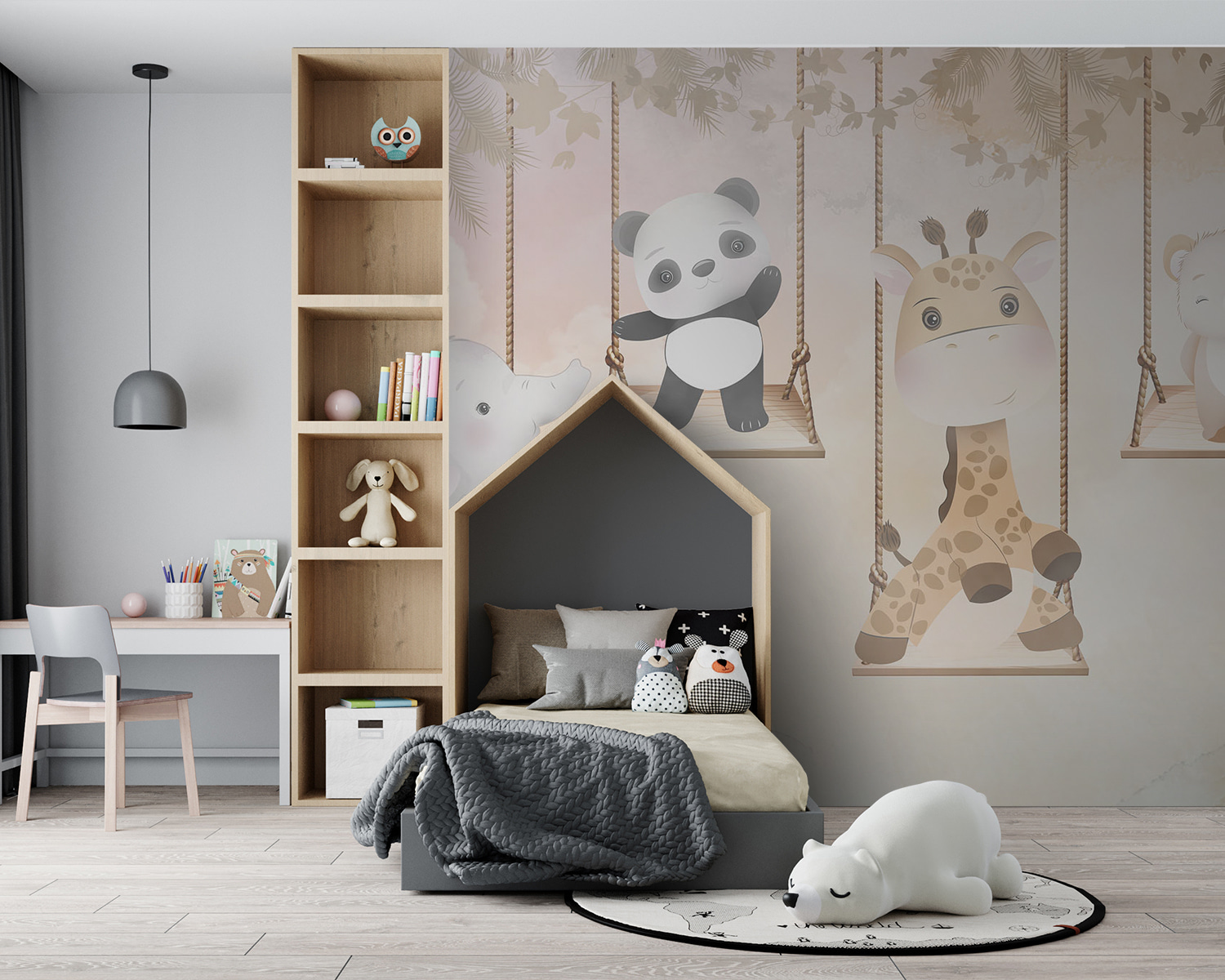 Prohlédněte si tuto nádhernou nástěnnou malbu s názvem “Nástěnné malby Žirafa sedící na provazové houpačce”. Tato nástěnná malba, která je ideální pro přidání kapky rozmarnosti do dětského pokoje, představuje roztomilou žirafu, která se chladí na houpačce a je obklopena rozkošnými zvířecími přáteli, jako je panda, slon a medvěd. Dokážete si představit, jak okouzlující by to bylo v pokojíčku malé holčičky? Nebo dokonce v hravém koutku v obývacím pokoji?