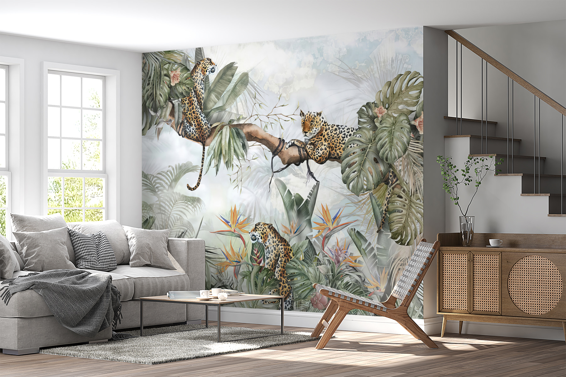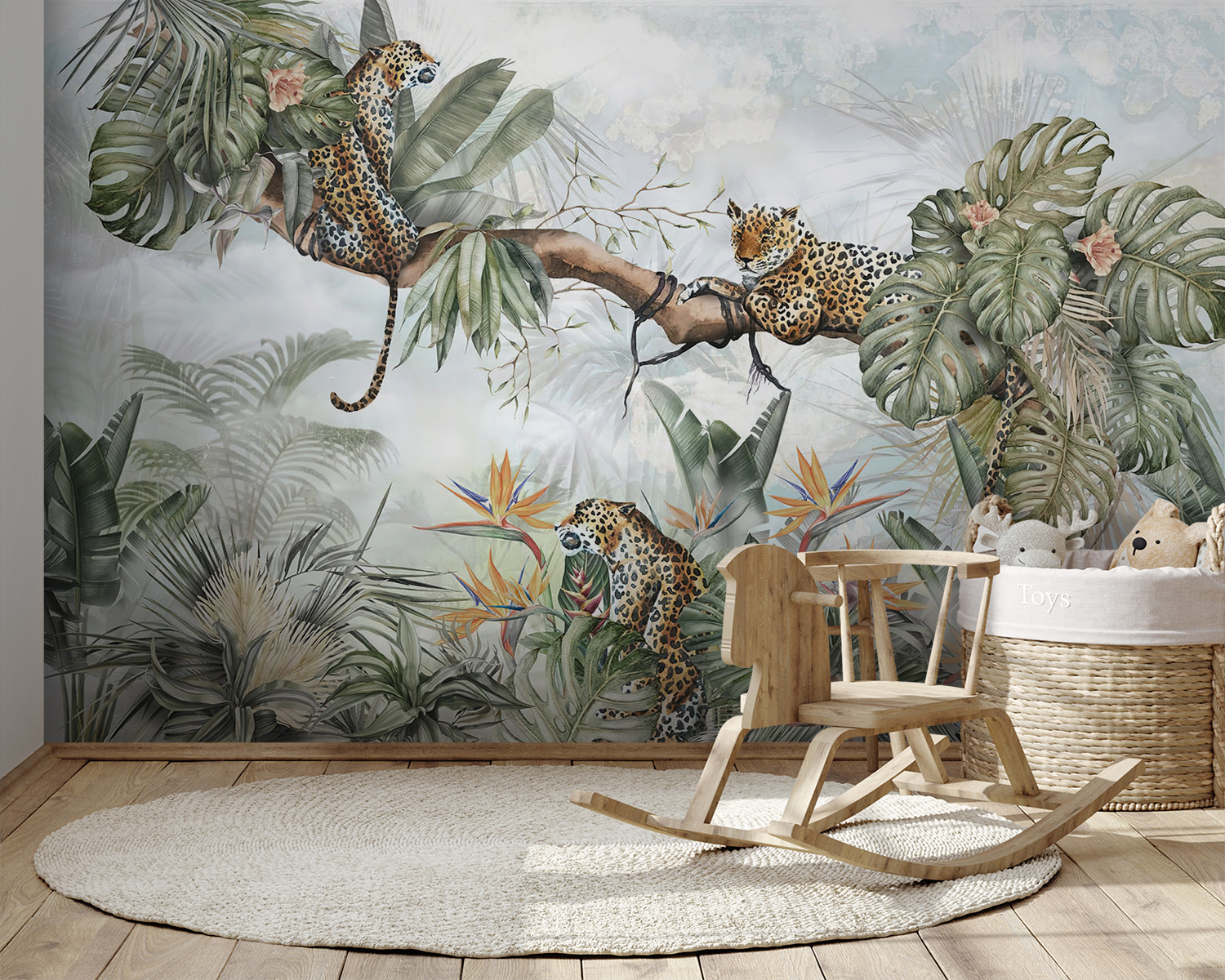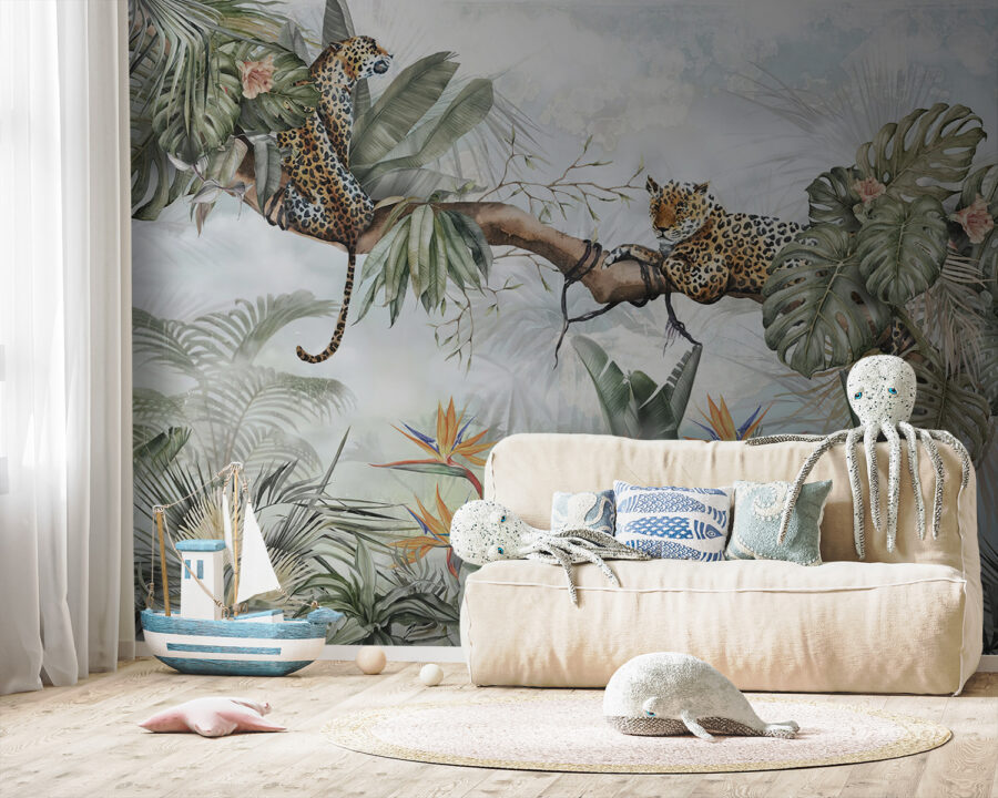 Proměňte svůj prostor pomocí této okouzlující nástěnné malby s motivem leoparda v bujné džungli. Představte si útulné zákoutí, kde mohou děti popustit uzdu své fantazii – ať už jde o dobrodružné příběhy o objevitelích džungle, nebo o klidná odpoledne strávená v objetí s knihou. Ti hraví leopardi usazení v listnatých stromech vzbudí zvědavost a úžas. Zářivá zeleň a barevné květy vytvářejí veselou kulisu, která působí svěže a živě. Je ideální pro doplnění interiéru o kousek přírody, díky kterému se každý pohled stane mini únikem. Nadechněte se tedy atmosféry džungle a zábava může začít!