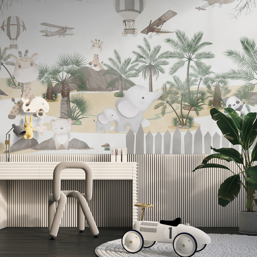Představte si, že se dětský pokoj promění ve snové safari dobrodružství! Přesně to získáte s nástěnnou malbou “Žirafa s palmami”. Na této okouzlující fototapetě jsou rozkošné žirafy s pozadím svěžích palem, hravých slonů a dokonce i balónků a letadel, které se vznášejí kolem. Je to jako vstoupit do laskavé džungle přímo z pohádkové knihy.