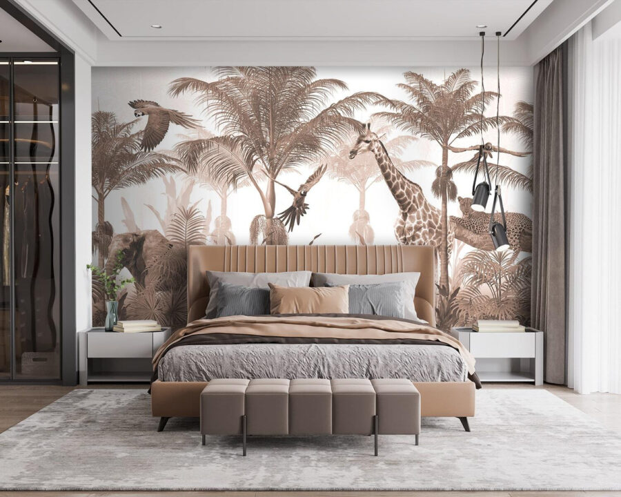 S touto okouzlující fototapetou s žirafou a ptákem dovádějícími uprostřed bujného lesa proměníte každou místnost v divoké útočiště. Je to jako mít mini safari přímo u vás doma, kde každý pohled vyvolá trochu radosti. Představte si děti, jak se chichotají, když spatří každé zvíře, které se skrývá v listí, nebo útulné večery strávené vyprávěním příběhů o dobrodružstvích v džungli. Zemité tóny vytvářejí uklidňující atmosféru, která je ideální pro dětský pokoj nebo hernu. Tato nástěnná malba není jen dekorací – je to brána k představivosti, která přináší zázraky přírody do interiéru. Kdo by se nechtěl každý den cítit jako na dobrodružné cestě džunglí?