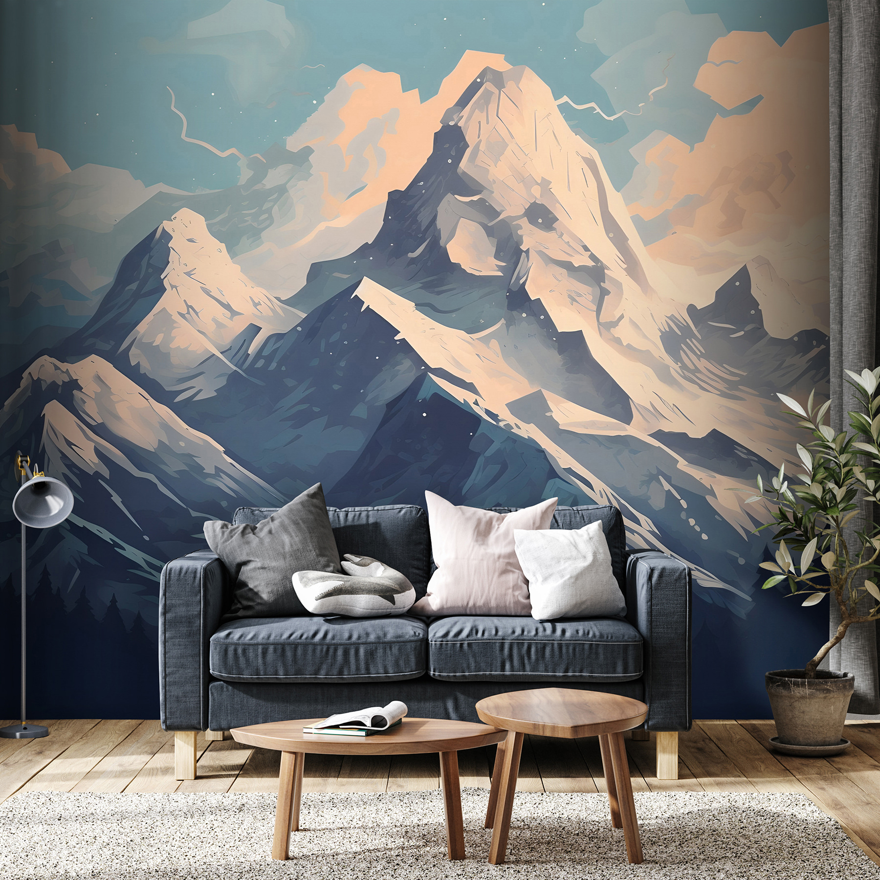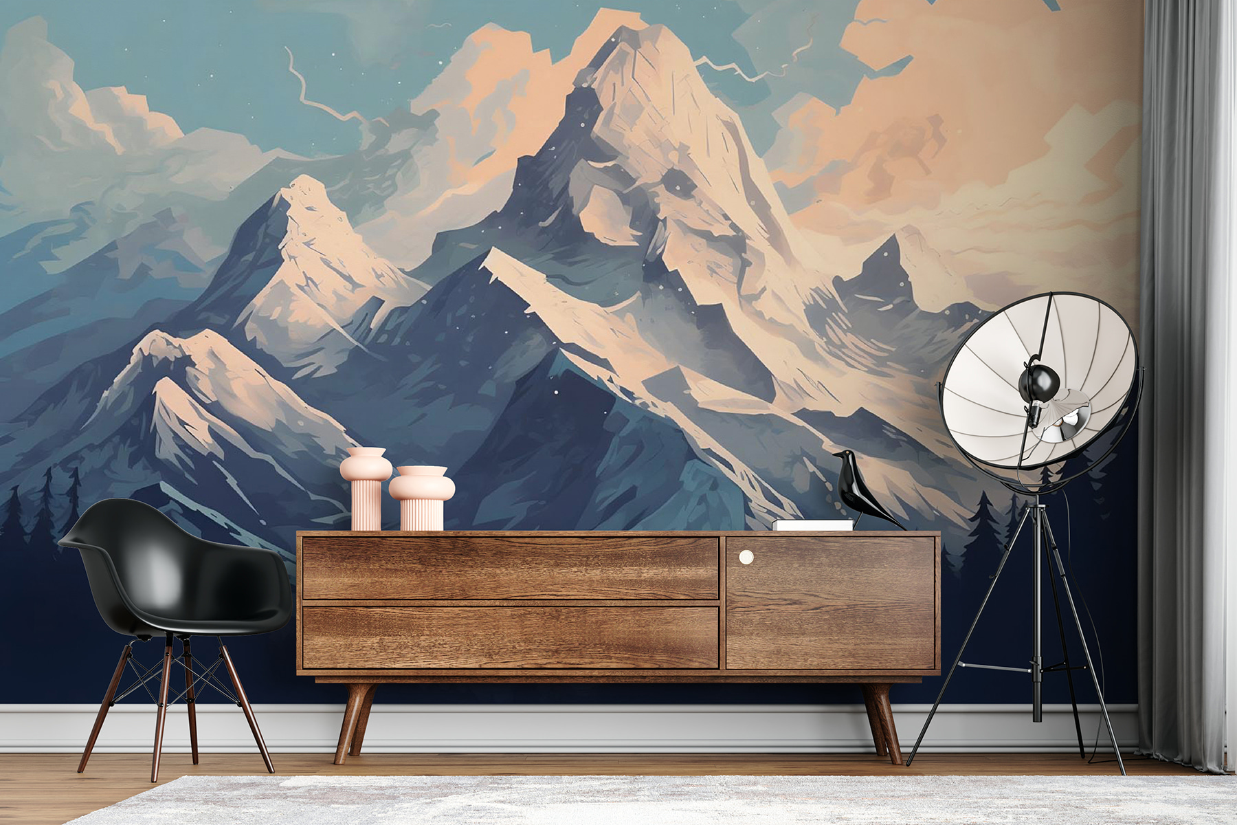 Představte si, že vstoupíte do útulné chaty, ve vzduchu se vznáší vůně borovice a najednou je tu freska vysokých hor zahalených do sněhové peřiny a nadýchaných mraků. Tento kousek není jen kulisou, je to výzva ke snění o svěžích alpských ránech a dobrodružstvích, která na vás čekají hned za dveřmi. Představte si, jak popíjíte horké kakao, zatímco svět venku je zahalen do bílé peřiny a vy vidíte jen tyto majestátní vrcholky. Tato nástěnná malba, která se skvěle hodí do obývacího pokoje nebo čtecího koutku, vnáší do interiéru venkovní atmosféru a každý pohled na ni se stává mini únikem. Ideální pro ty, kteří touží po doteku majestátnosti přírody bez mrazu!