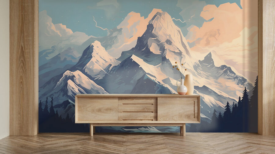 Představte si, že vstoupíte do útulné chaty, ve vzduchu se vznáší vůně borovice a najednou je tu freska vysokých hor zahalených do sněhové peřiny a nadýchaných mraků. Tento kousek není jen kulisou, je to výzva ke snění o svěžích alpských ránech a dobrodružstvích, která na vás čekají hned za dveřmi. Představte si, jak popíjíte horké kakao, zatímco svět venku je zahalen do bílé peřiny a vy vidíte jen tyto majestátní vrcholky. Tato nástěnná malba, která se skvěle hodí do obývacího pokoje nebo čtecího koutku, vnáší do interiéru venkovní atmosféru a každý pohled na ni se stává mini únikem. Ideální pro ty, kteří touží po doteku majestátnosti přírody bez mrazu!