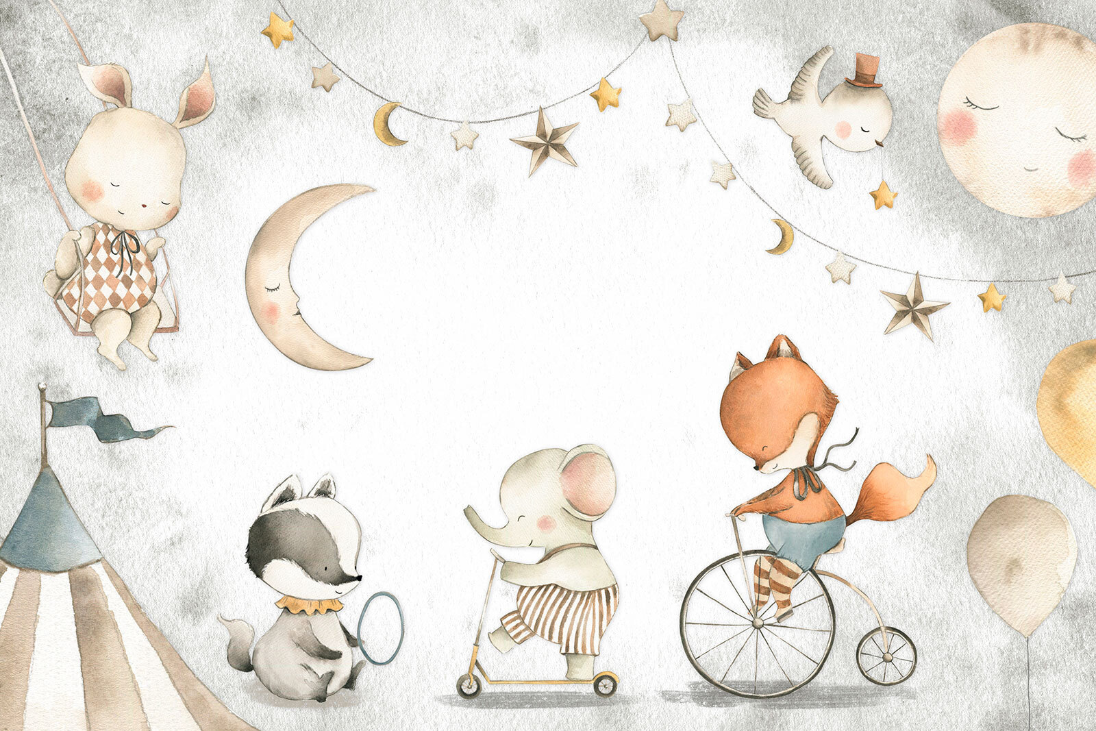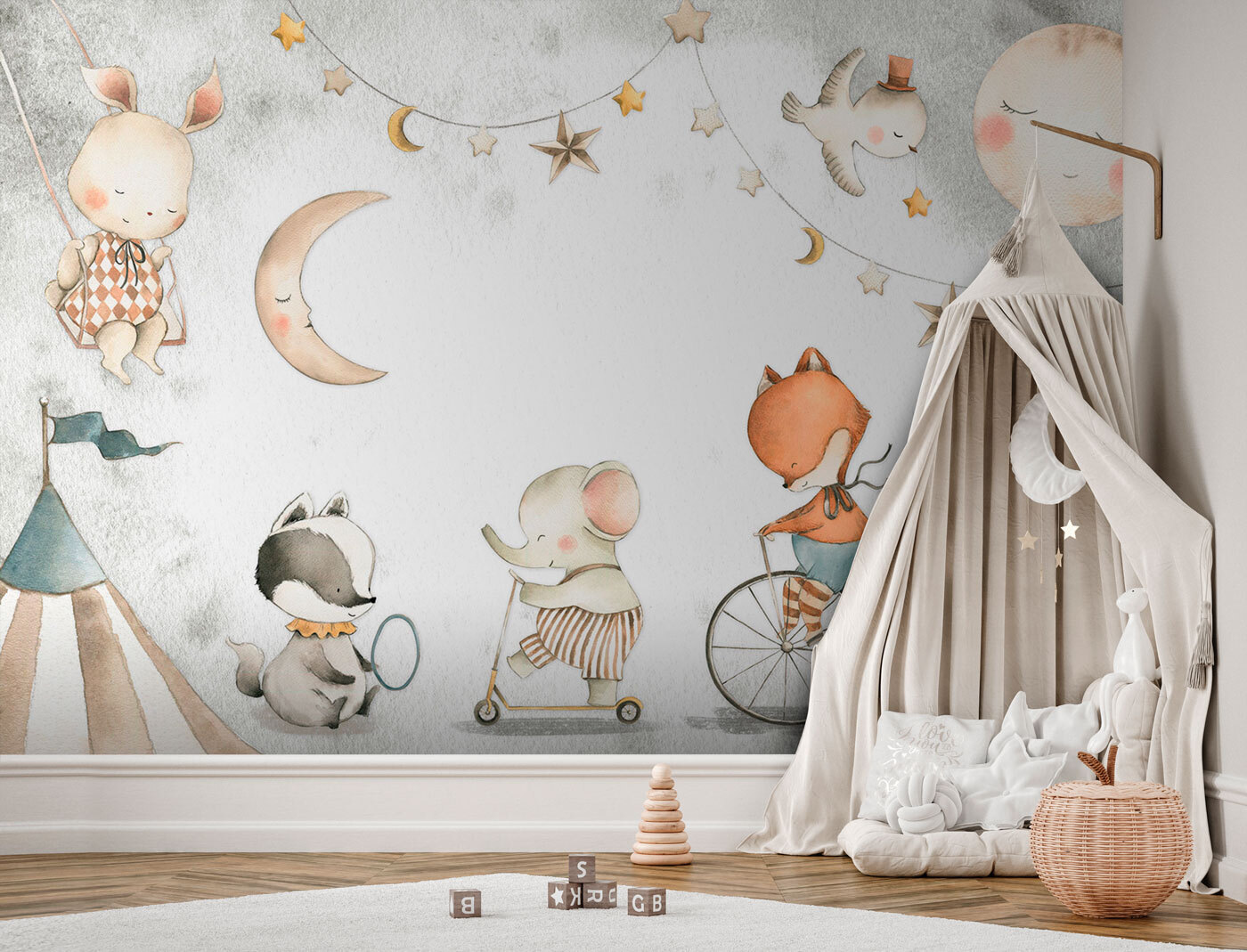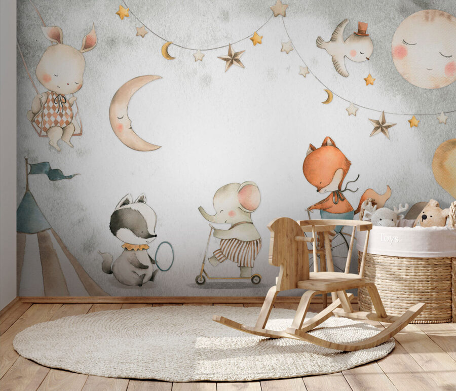 Proměňte dětský pokoj v rozmarnou říši divů s fototapetou “Hravá zvířátka na cirkusovém karnevalu”. Tento okouzlující potisk vás unese do útulného, snového karnevalu, kde si půvabná zvířátka hrají a dovádějí pod hvězdnou oblohou. Je ideální pro přidání kouzelného nádechu do ložnic nebo dětských koutků a zobrazuje roztomilého králíčka, hravou lišku a další roztomilé kamarády, kteří se baví na různých pouťových atrakcích. Budete rádi sledovat, jak se tvář vašeho děťátka rozzáří, když objeví rozkošné scény. Není to jen dekorace na zeď, je to každodenní dávka radosti. Představte si pohádky před spaním na tomto pozadí – čiré kouzlo!