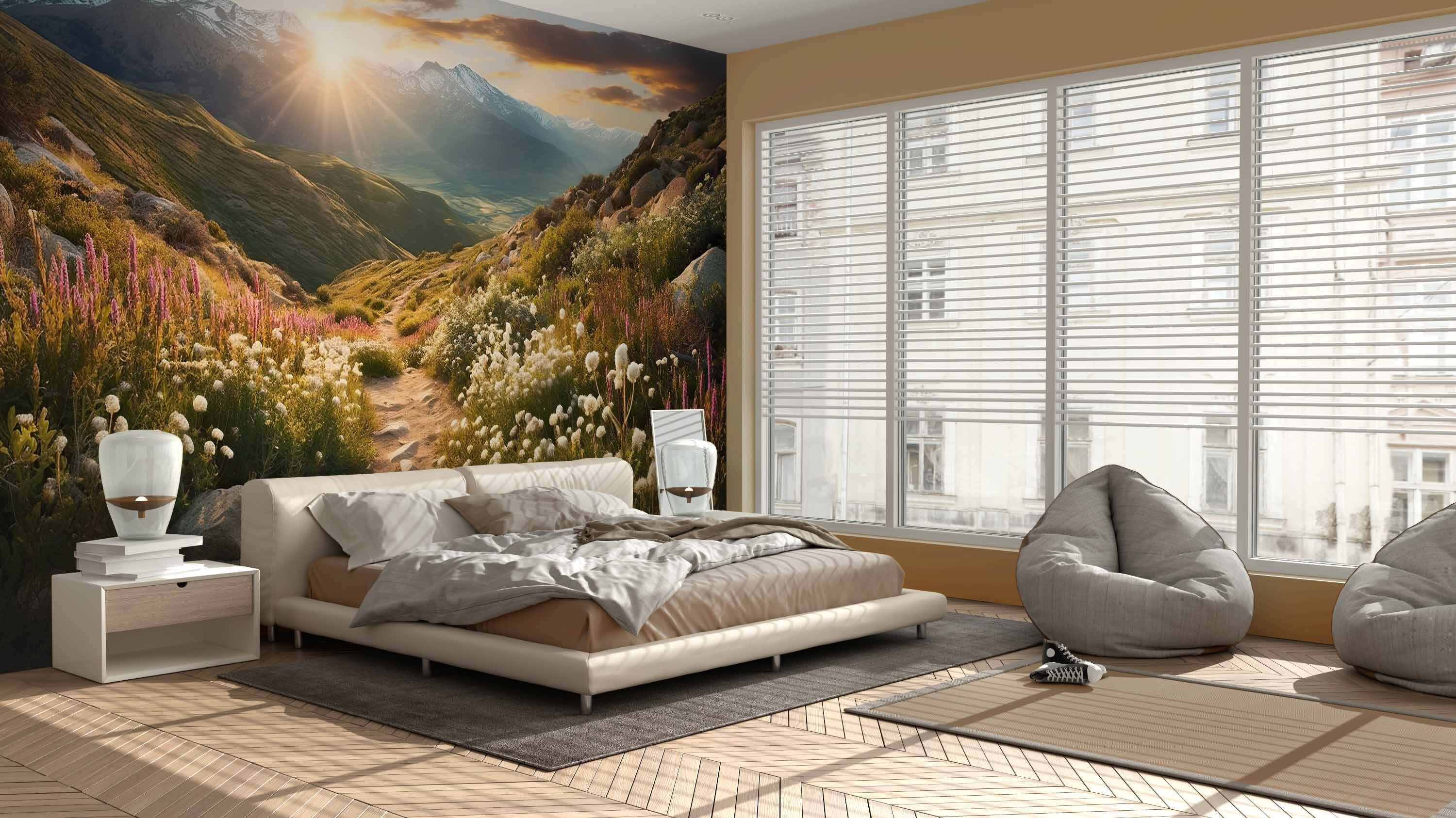 Proměňte fádní prostor ve snové útočiště s nástěnnou malbou “Západ slunce nad horskou květinovou stezkou”. Představte si, že vstoupíte do klidného světa, kde živé divoké květiny tančí ve větru a majestátní hory se táhnou do nekonečna. Tato nástěnná malba vás vybízí k hlubšímu nádechu, pocítíte teplo západu slunce a přijmete klid přírody přímo u vás doma.