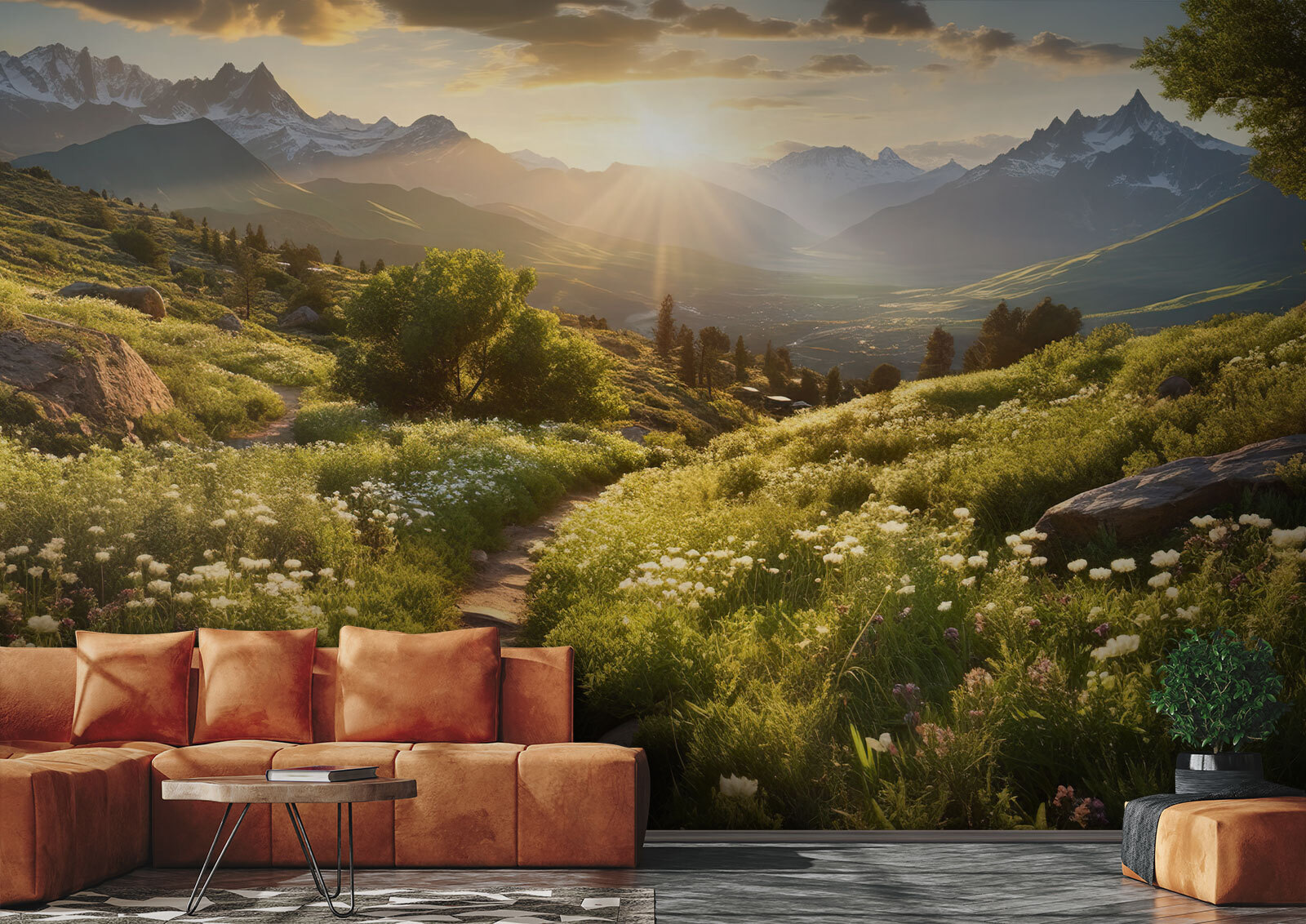 Dobře, představte si to: jste ve svém obývacím pokoji, ale najednou nejste. Tahle nástěnná malba? To dělá. Je to, jako byste vstoupili do klidného útočiště, obklopeni bujným stromovím a majestátními horami v dálce. Téměř ucítíte svěží horský vzduch a uslyšíte šumění listí.