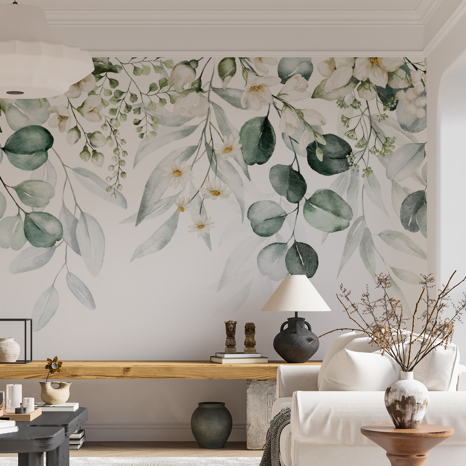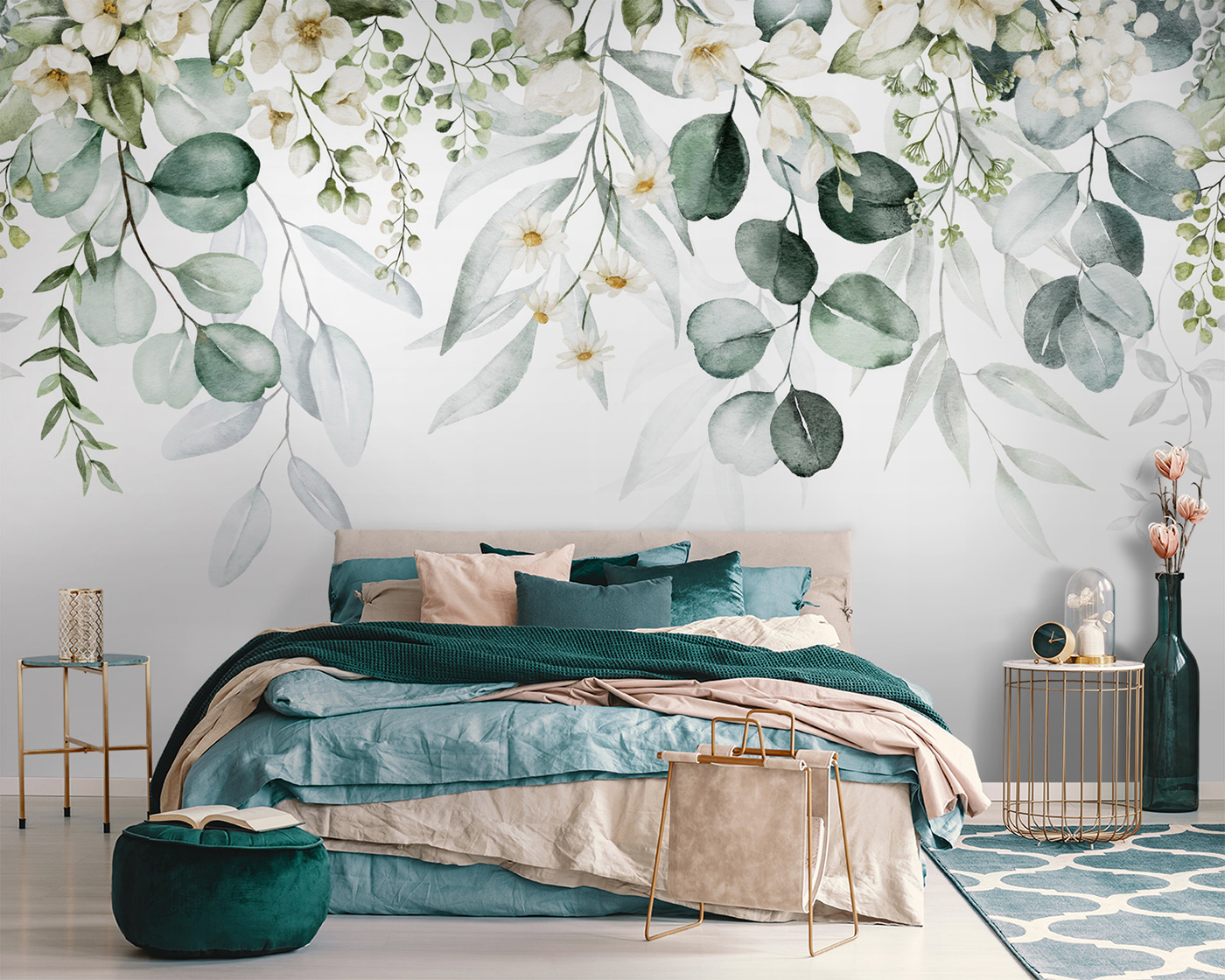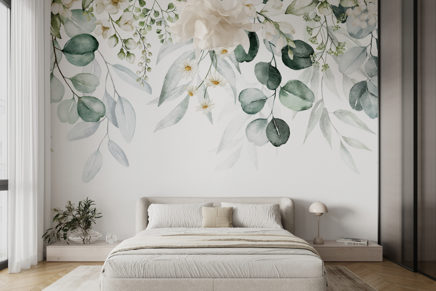 Proměňte jakýkoli prostor v oázu klidu pomocí této úžasné nástěnné malby s elegantními listy a nádhernými květinovými aranžmá. Představte si, že vstoupíte do místnosti, kde vás svěží zeleň a jemné květy přivítají jako lákavé objetí. Je to jako přenést přírodu do interiéru bez hmyzu – a kdo by to neměl rád? Tato nástěnná malba vyzařuje kouzlo a je ideální pro útulný čtecí koutek nebo stylový obývací pokoj. Akvarelový efekt mu dodává snový charakter, takže při popíjení šálku čaje snadno ztratíte pojem o čase. Hosté se nechají strhnout a pravděpodobně na chvíli ocení toto umění. Ať už se jedná o svěží aktualizaci nebo kompletní přestavbu, tato nástěnná malba slibuje vdechnout jakémukoli prostoru teplo a živost. Nechte krásu přírody inspirovat váš každodenní život!