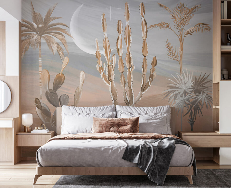 Podívejte se na tuto radikální nástěnnou malbu! Představte si, že si kousek pouště přenesete přímo do obývacího pokoje – kaktusy, palmy a zasněnou krajinu. Je to jako vstoupit do klidné oázy bez spalujícího horka a pichlavých rostlin. Ideální pro dodání nádechu putování do jakéhokoli prostoru.