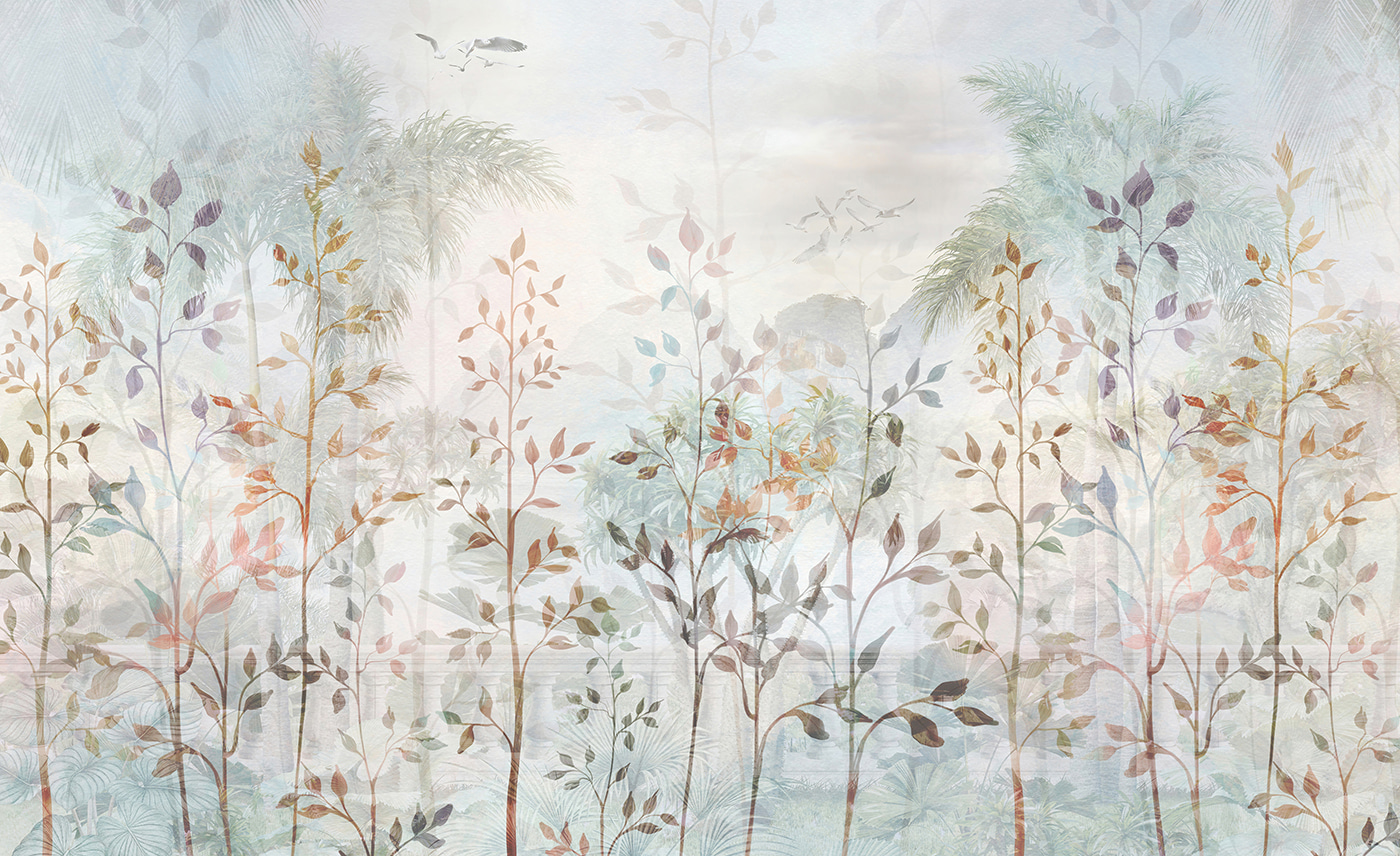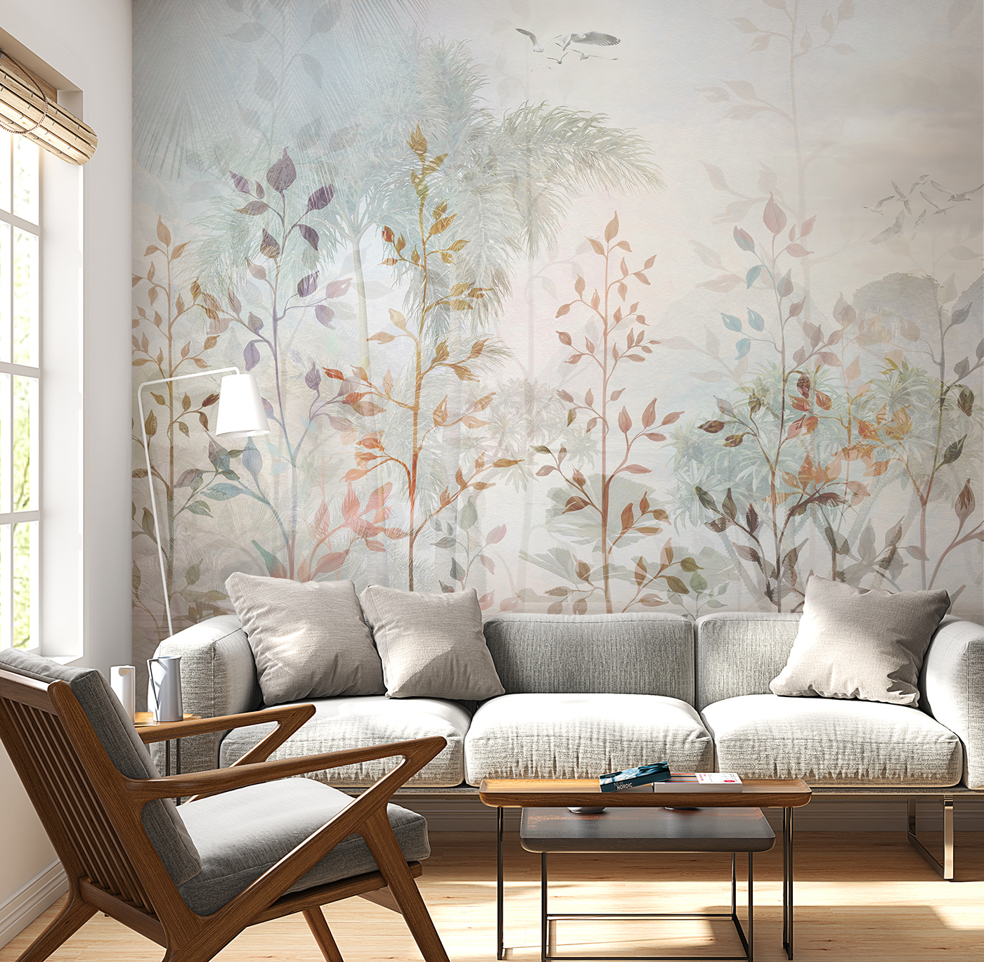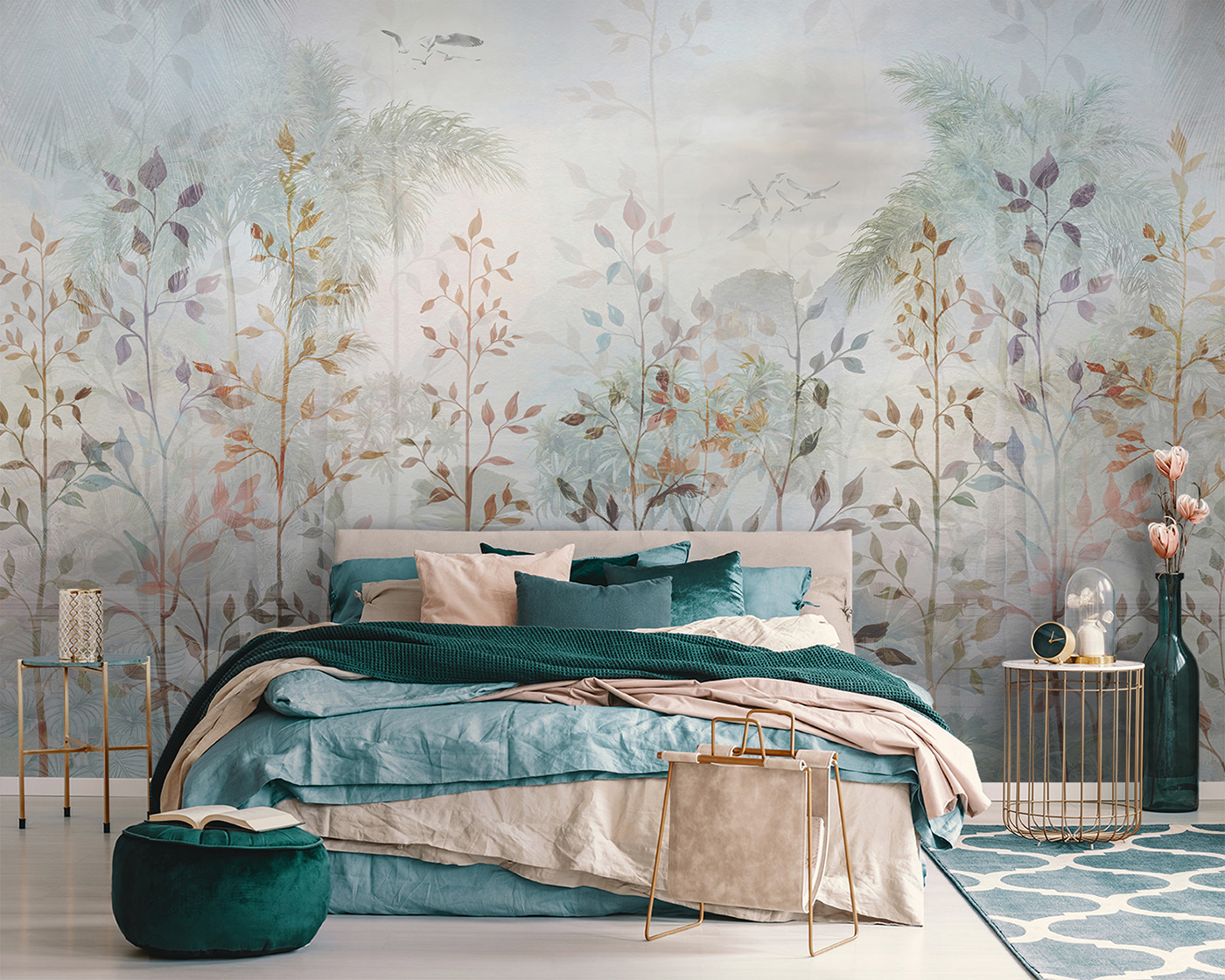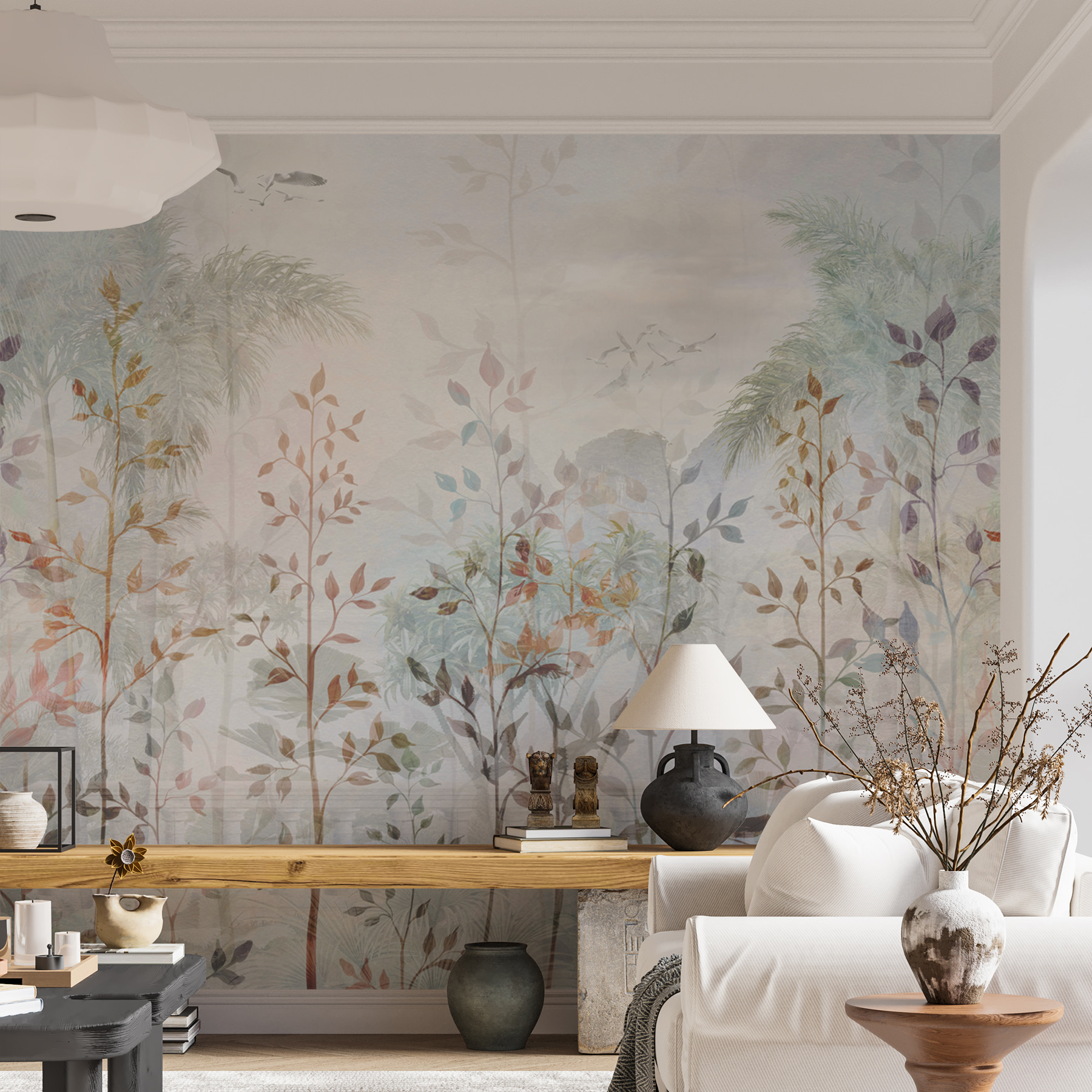 S nástěnnou malbou “Přírodní pastelová krajina snů v mlze” proměníte každou místnost ve snový únik. Toto úchvatné umělecké dílo zve do interiéru na klid přírody a vyznačuje se jemnými pastelovými barvami, které jemně tančí po stěnách. Představte si, jak popíjíte ranní kávu obklopeni šumícími listy a jemně se pohupujícími rostlinami. Je to jako mít klidnou zahradu přímo u vás doma. Každý pohled vás vtáhne dovnitř a nechá vás přemýšlet, zda byste nemohli projít nástěnnou malbou a procházet se mezi těmito stromy. Ideální pro prostory, které touží po troše klidu a jiskře rozmarnosti! Kdo by řekl, že dekorace na stěnu může působit tak živě?