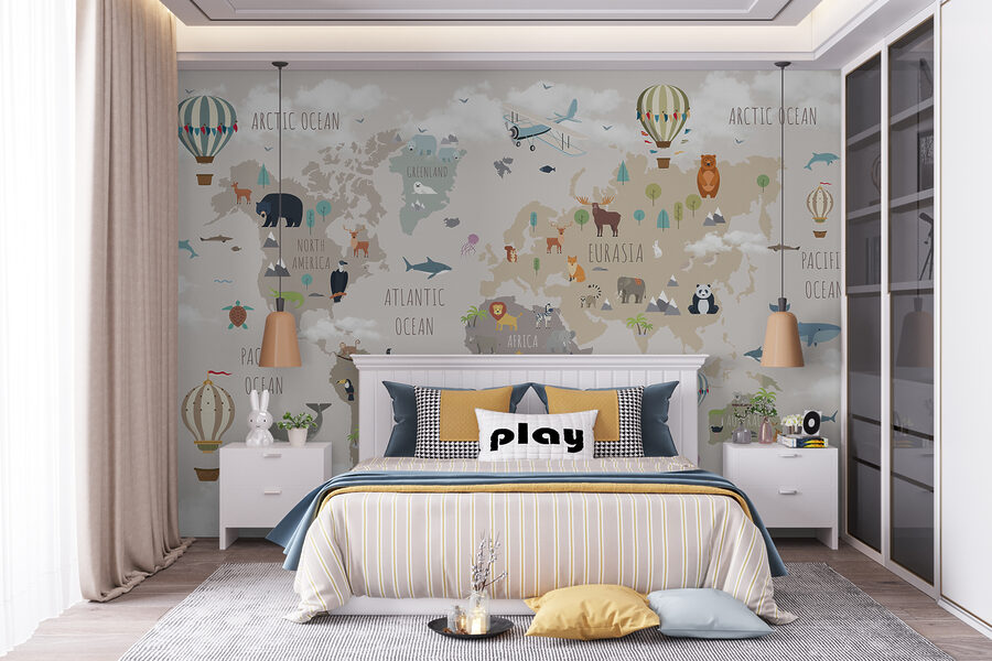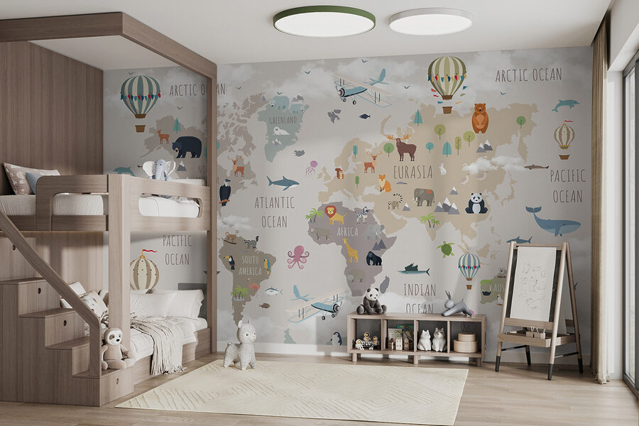 Tato nástěnná malba není jen dekorace – je to celý zážitek. Děti se mohou učit o různých kontinentech a oceánech a zároveň pozorovat svá oblíbená zvířata, od ledních medvědů v Grónsku po klokany v Austrálii. Tlumené barvy jsou uklidňující, ideální pro pohádky před spaním nebo líná nedělní odpoledne. Je to druh dekoru, který podněcuje představivost a zvědavost, takže se skvěle hodí do dětských pokojů, heren nebo dokonce tříd. Každý den navíc můžete pozorovat nové detaily, které udržují kouzlo při životě.