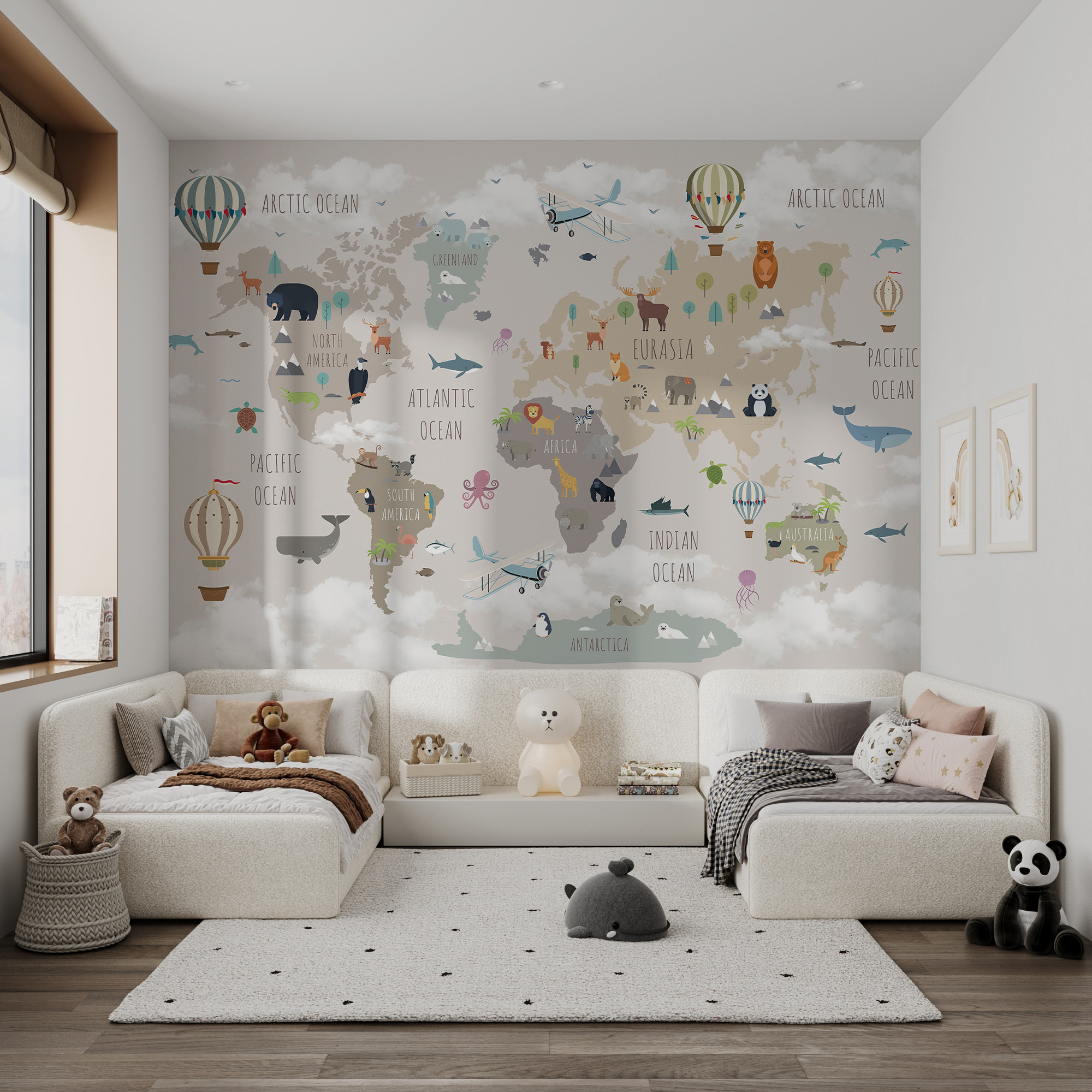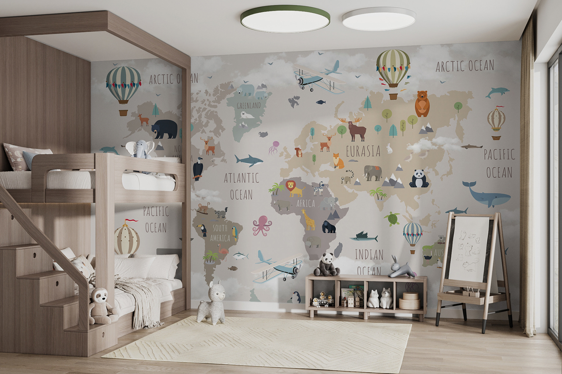 Tato nástěnná malba není jen dekorace – je to celý zážitek. Děti se mohou učit o různých kontinentech a oceánech a zároveň pozorovat svá oblíbená zvířata, od ledních medvědů v Grónsku po klokany v Austrálii. Tlumené barvy jsou uklidňující, ideální pro pohádky před spaním nebo líná nedělní odpoledne. Je to druh dekoru, který podněcuje představivost a zvědavost, takže se skvěle hodí do dětských pokojů, heren nebo dokonce tříd. Každý den navíc můžete pozorovat nové detaily, které udržují kouzlo při životě.
